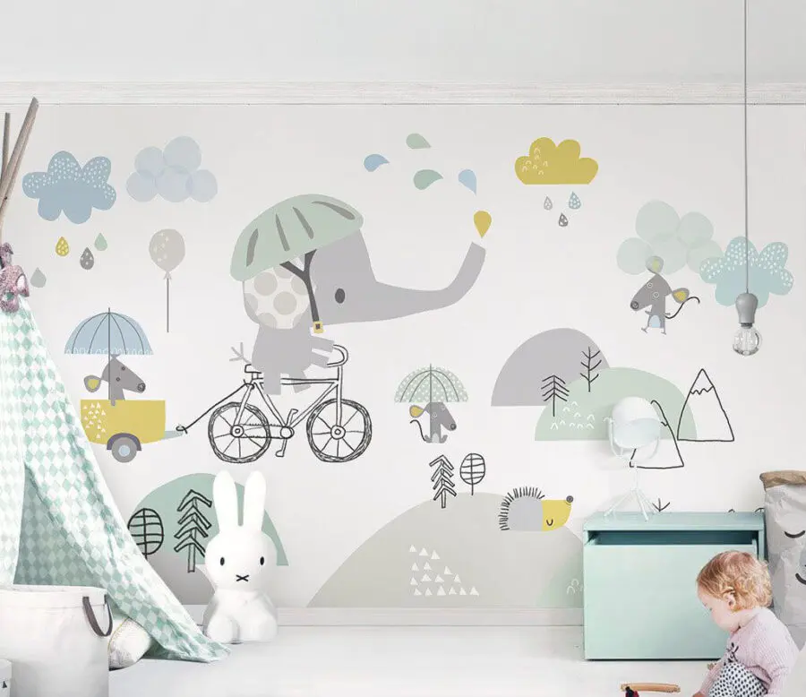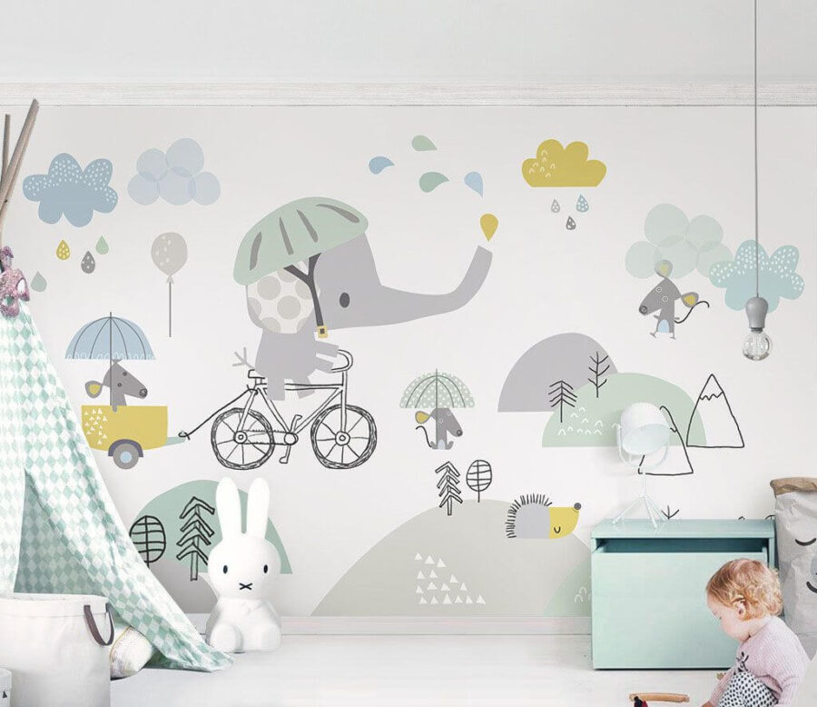 Brighten up any child’s room with this delightfully whimsical mural featuring a cartoon elephant on a bicycle—who wouldn’t want to see that? Imagine little ones gazing at this big guy, pedaling through a soft landscape with his animal pals. It’s like a storybook come to life! The playful colors and cute characters invite smiles, making it the perfect backdrop for adventures. Picture the giggles as kids share their own tales of escapades with this cheerful elephant. It’s more than decor; it’s a daily dose of joy! Perfect for sparking imagination.