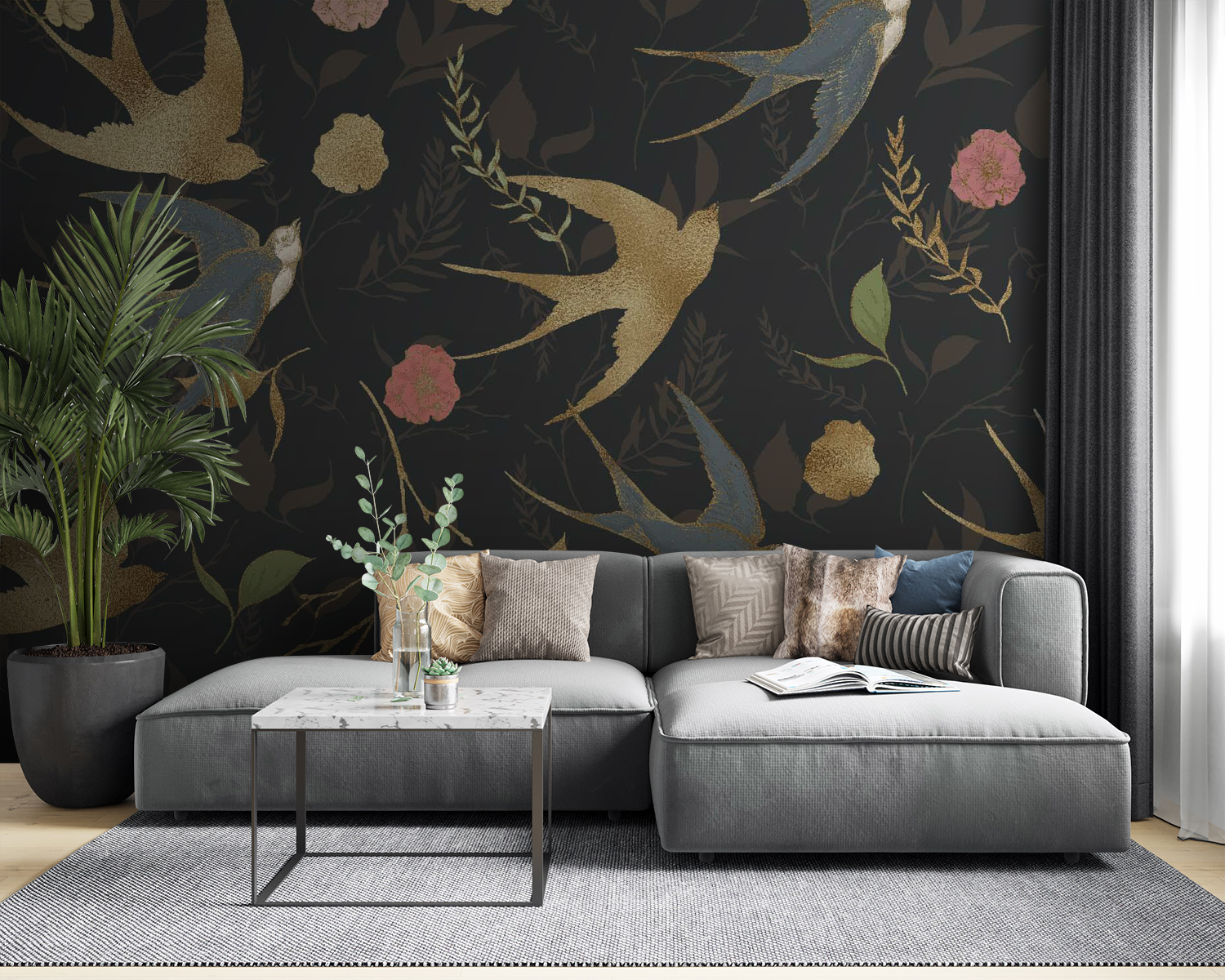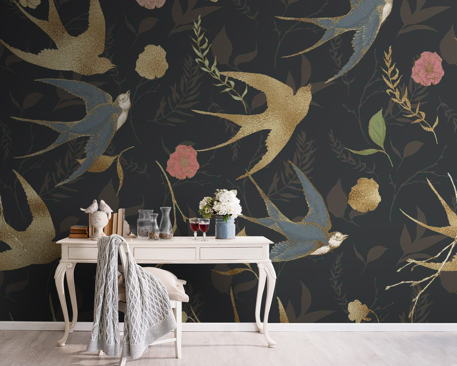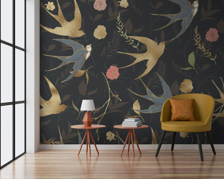 Transformeer elke ruimte met deze prachtige muurschildering met een patroon van grillige vogels en charmante bloemen. Stel je voor dat je je kamer binnenstapt en begroet wordt door levendige wervelingen van kleur – de vogels lijken bijna in volle vlucht, klaar om je mee te nemen op avontuur. De bloementoetsen voegen een zachte warmte toe die je uitnodigt om even stil te staan, adem te halen en je omgeving te waarderen. Het is alsof je een tuin en vogelvrienden aan je muren hebt hangen, perfect voor gezellige avonden of levendige bijeenkomsten. Haal de natuur naar binnen en laat je muren een eigen verhaal vertellen!
