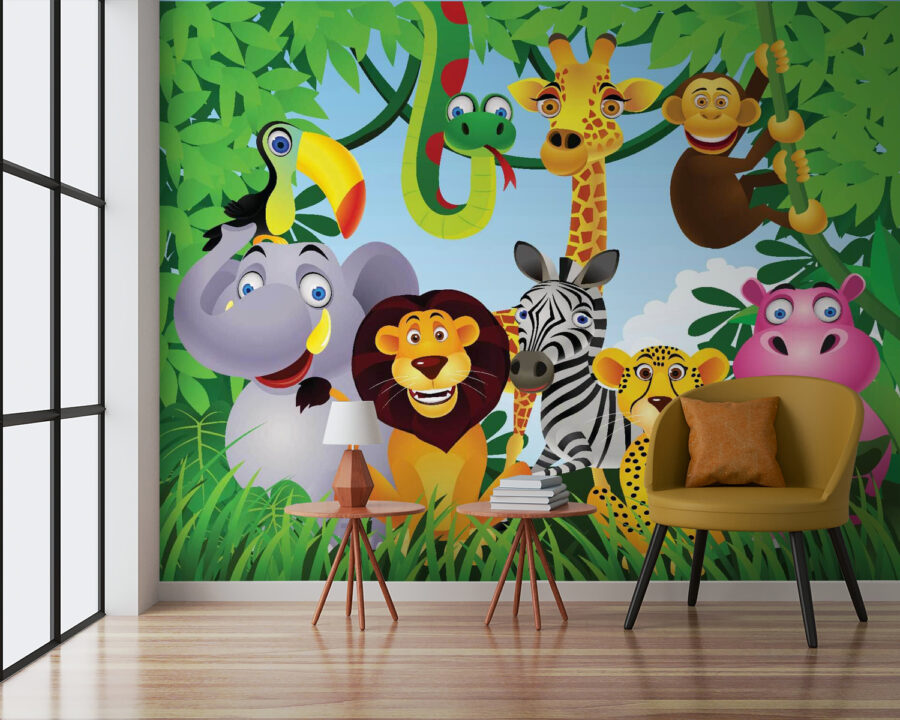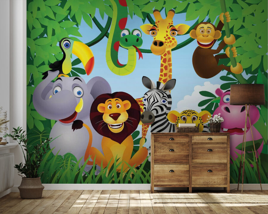 Verander elke ruimte in een levendig jungleavontuur met deze vrolijke muurschildering met een levendige groep dieren. Stel je een olifant voor met een gekke grijns, een dansende giraf en een wijze oude leeuw – elk met een uitgesproken persoonlijkheid! Deze muurschildering is niet alleen decoratie, het is een poort naar de verbeelding. Kinderen zullen het geweldig vinden om hun favoriete dieren te zoeken, terwijl volwassenen misschien wel een glimp van hun innerlijke kind opvangen. Perfect voor speelkamers of kinderkamers, het brengt een vleugje plezier en gelach aan de muren. Wie wil er nu niet dat zijn ruimte aanvoelt als een junglefeest? Het smeekt bijna om een verhaaltje onder zijn speelse bladerdak! Laat de wilde tijden maar komen!