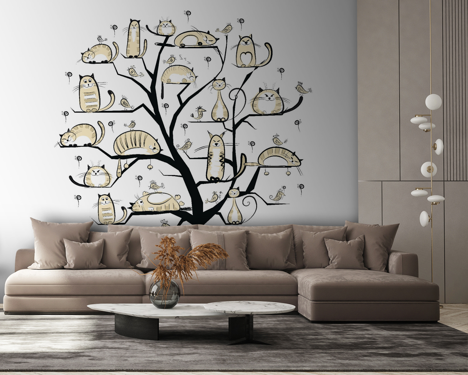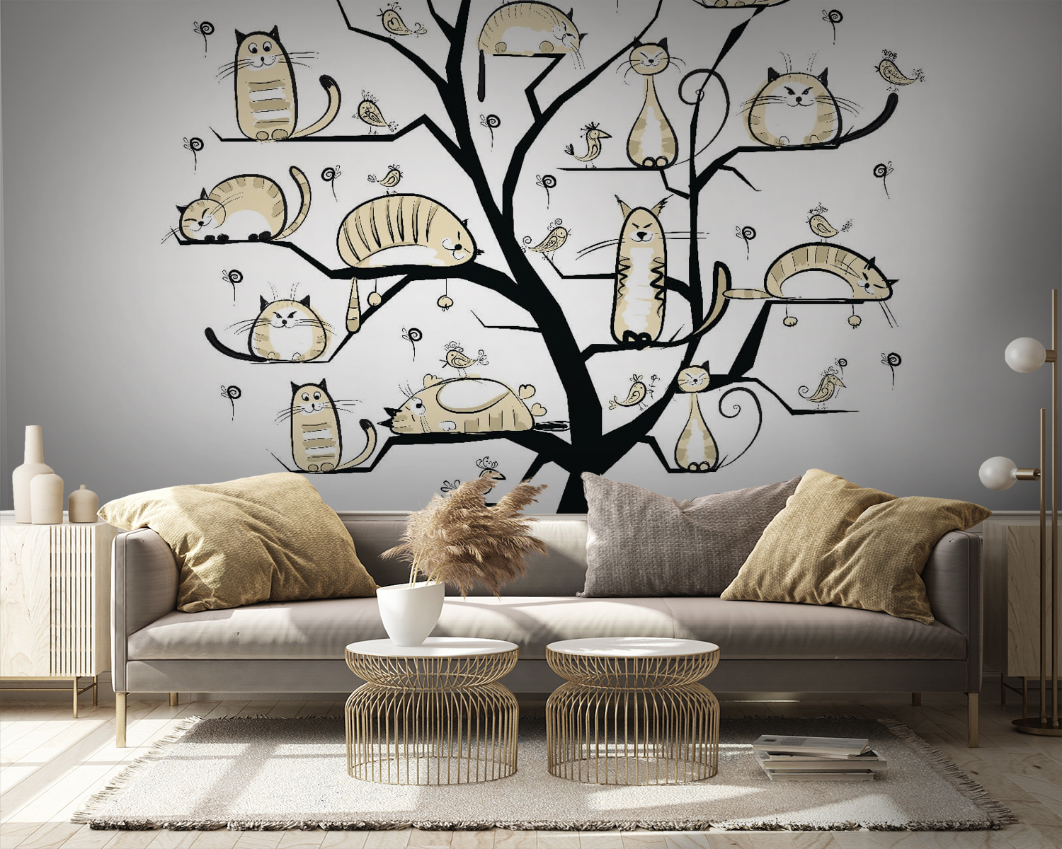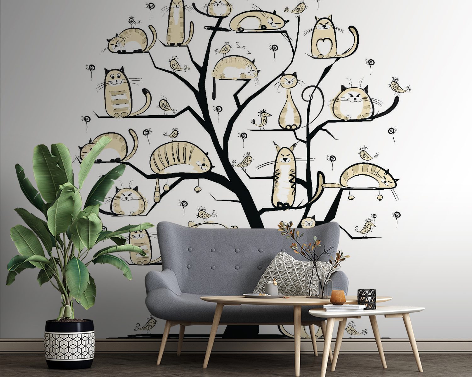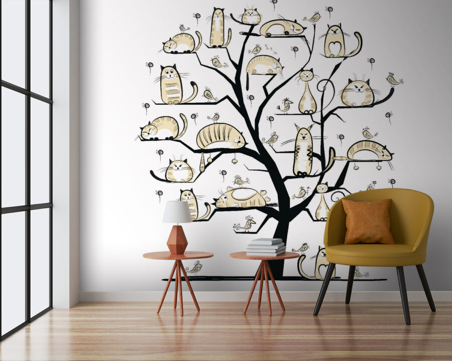 Imagine a whimsical tree, branches playfully adorned with cats of all shapes and sizes—some are snoozing, others plotting epic adventures. This mural isn’t just wall art; it’s a quirky conversation starter. Picture it in a cozy nook, where friends gather, and laughter fills the air. The soft, neutral tones create a calm vibe, perfect for those lazy Sundays when you just want to sip coffee and enjoy the charm of your space. It’s like having a feline family right on your wall, always ready to entertain—or nap. Cat lovers? They’ll be smitten.