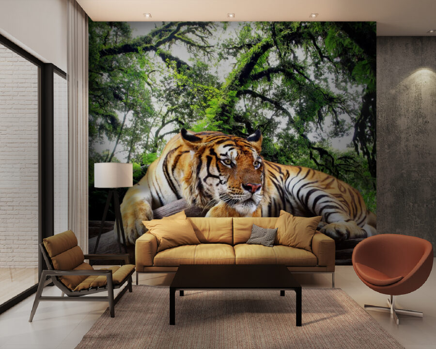 Transformeer uw ruimte met deze prachtige muurschildering ‘Tijger liggend op een boomstam’. Stel u voor dat u een kamer binnenloopt waar een majestueuze tijger ligt te luieren, waardoor de wildernis uw huis binnenkomt. Zijn levendige strepen en doordringende blik creëren een sfeer die zowel rustgevend als avontuurlijk is – perfect voor dagdromers en natuurliefhebbers. Deze muurschildering roept de sfeer van de jungle op, waardoor u het gevoel krijgt dat u een rustig moment deelt met dit prachtige dier. Het is alsof u een stukje van de tropen aan uw muur heeft hangen, dat elke keer dat u ernaar kijkt een gevoel van verwondering oproept. Bovendien is het een geweldige gespreksstarter: gasten zullen niet kunnen weerstaan om hun favoriete tijgerverhalen te delen!