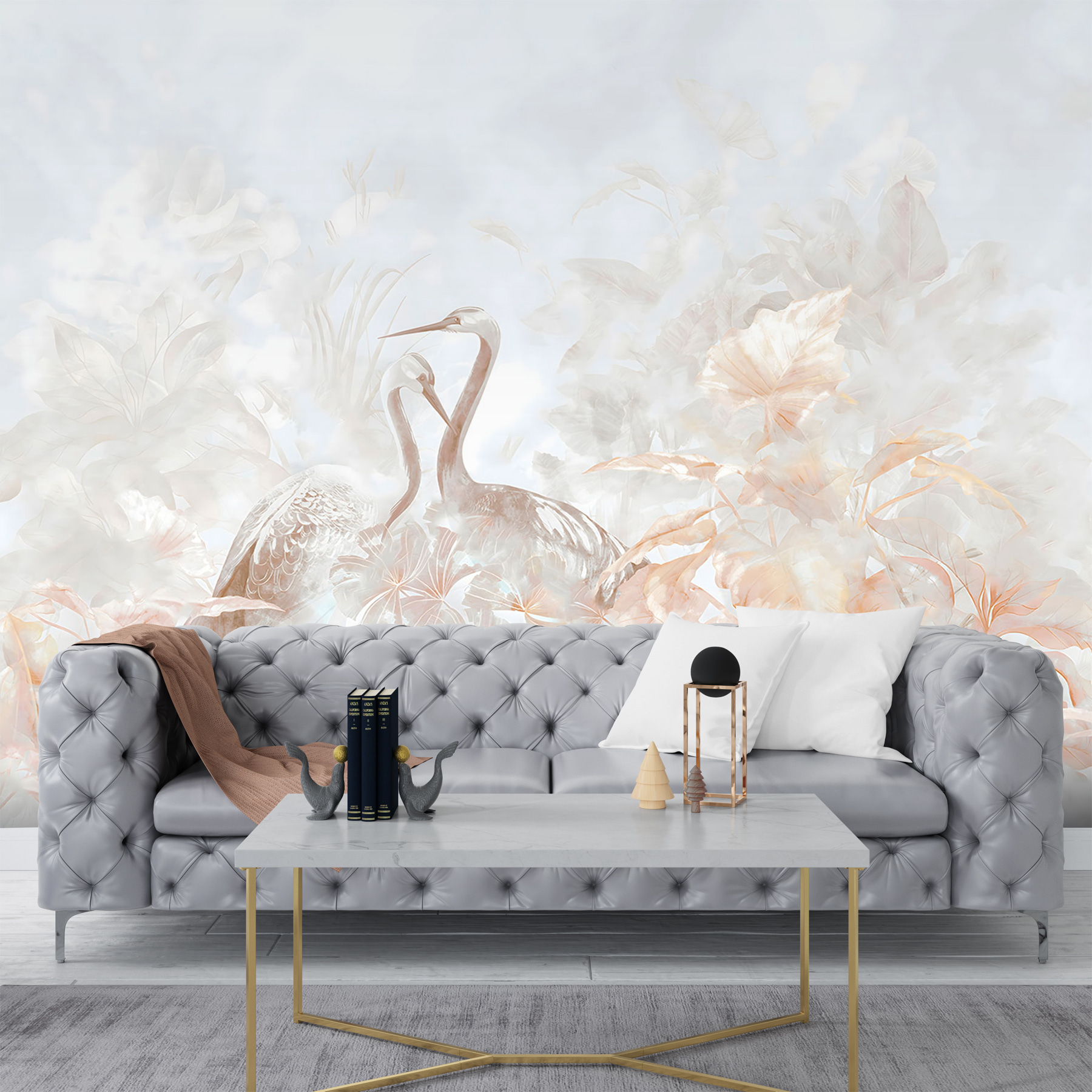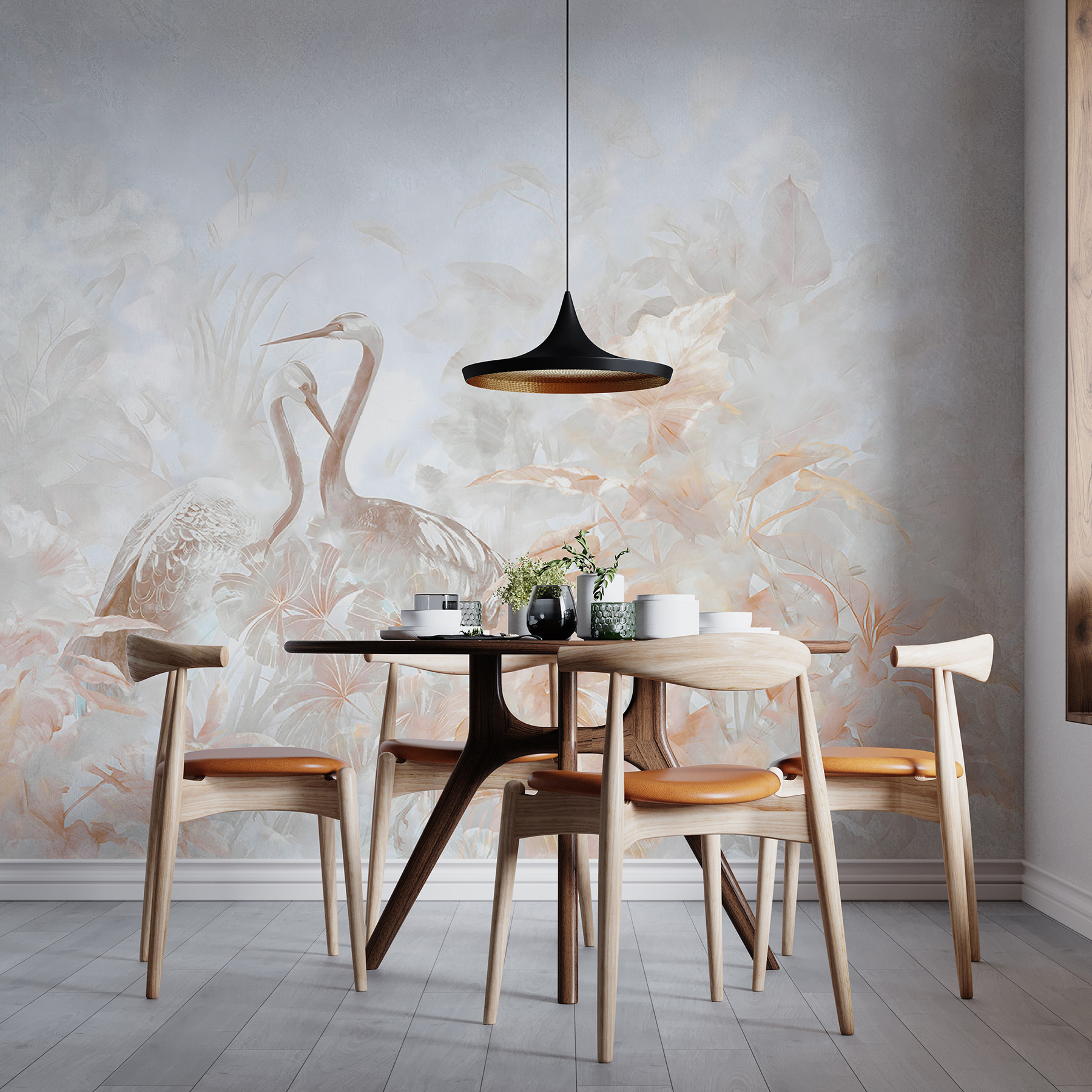Stel je een serene ontsnapping op je muur voor met de muurschildering “Kraanvogels temidden van weelderig gebladerte”. Dit is niet alleen decor, het is een hele sfeer – perfect voor iedereen die houdt van een beetje elegantie uit de natuur. Twee sierlijke kraanvogels mengen zich te midden van een zee van zachte bladeren en creëren een verbluffende en rustige sfeer. De zachte kleuren geven het gevoel van een dromerige, mistige ochtend in een exotisch oord (zonder dat je ooit in het vliegtuig hoeft te stappen). Het is alsof je het leven op pauze zet en een koele, verfrissende tuin inademt. Deze muurschildering is een mooi middelpunt voor je woonkamer of zelfs voor een rustige slaapkamer. Zin in een dagelijkse dosis zen? Met deze muurschildering zit je goed. Bovendien zal het zeker een gespreksstarter zijn – wie wil er nou niet praten over zo’n vredig, mooi tafereel bij jou thuis?