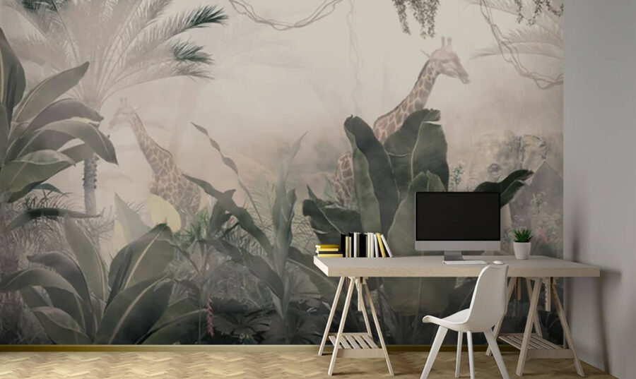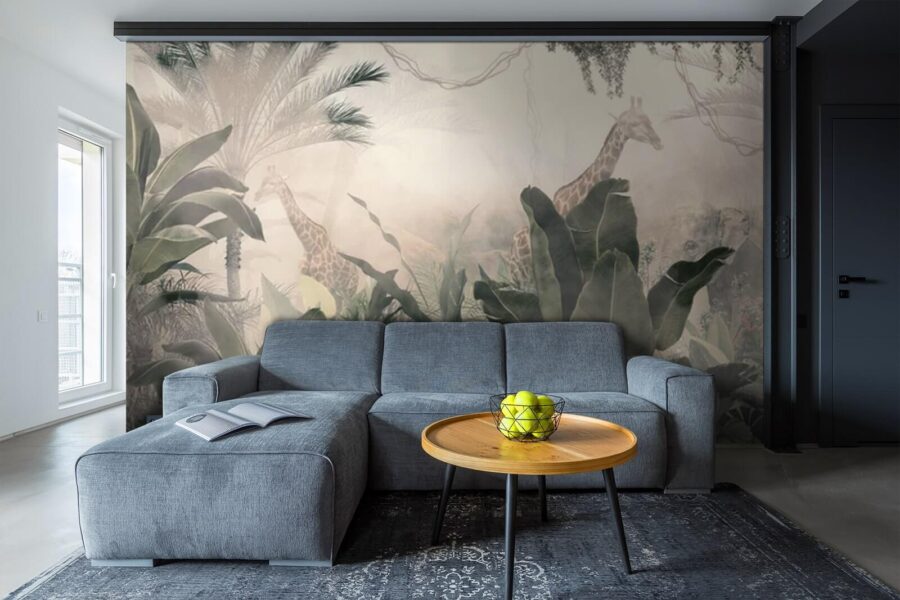 Verander uw ruimte in een sprookjesachtige jungle met deze muurschildering met sierlijke giraffen die tussen het weelderige groen door gluren. Het is alsof u een droom binnenstapt waar de natuur de boventoon voert. Stel je voor: je drinkt ‘s ochtends koffie, het zonlicht schijnt naar binnen en er staat een serene giraf nonchalant aan bladeren te knabbelen op je muur. Wie heeft er nog een safari nodig? De lagen gebladerte creëren een gevoel van diepte, waardoor kleine kamers ruimer aanvoelen. Het is een gespreksstarter – gasten zullen zeker even pauzeren om het te bewonderen. Perfect voor avontuurlijke zielen of iedereen die even aan het dagelijks leven wil ontsnappen. Een vleugje magie, gewoon thuis!
