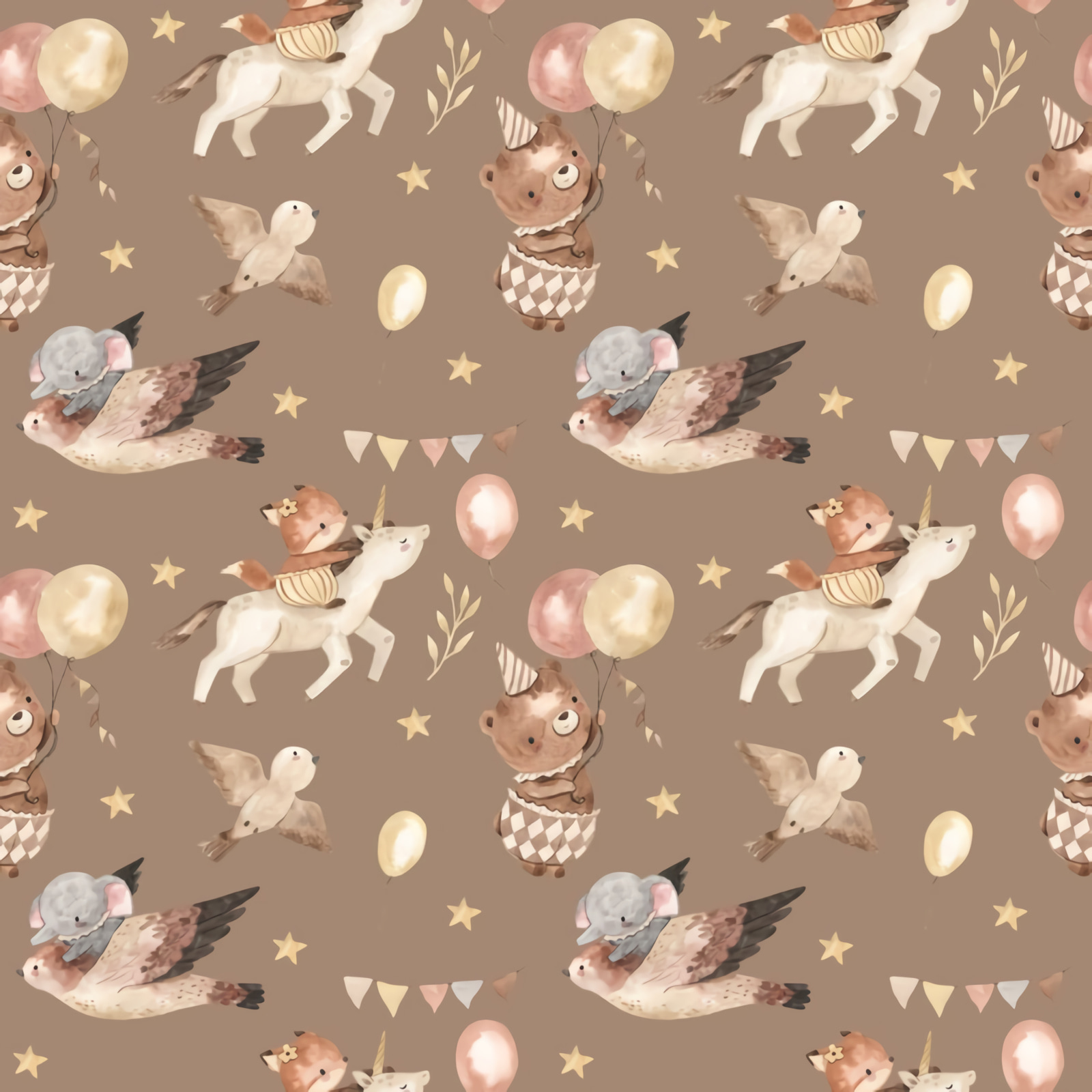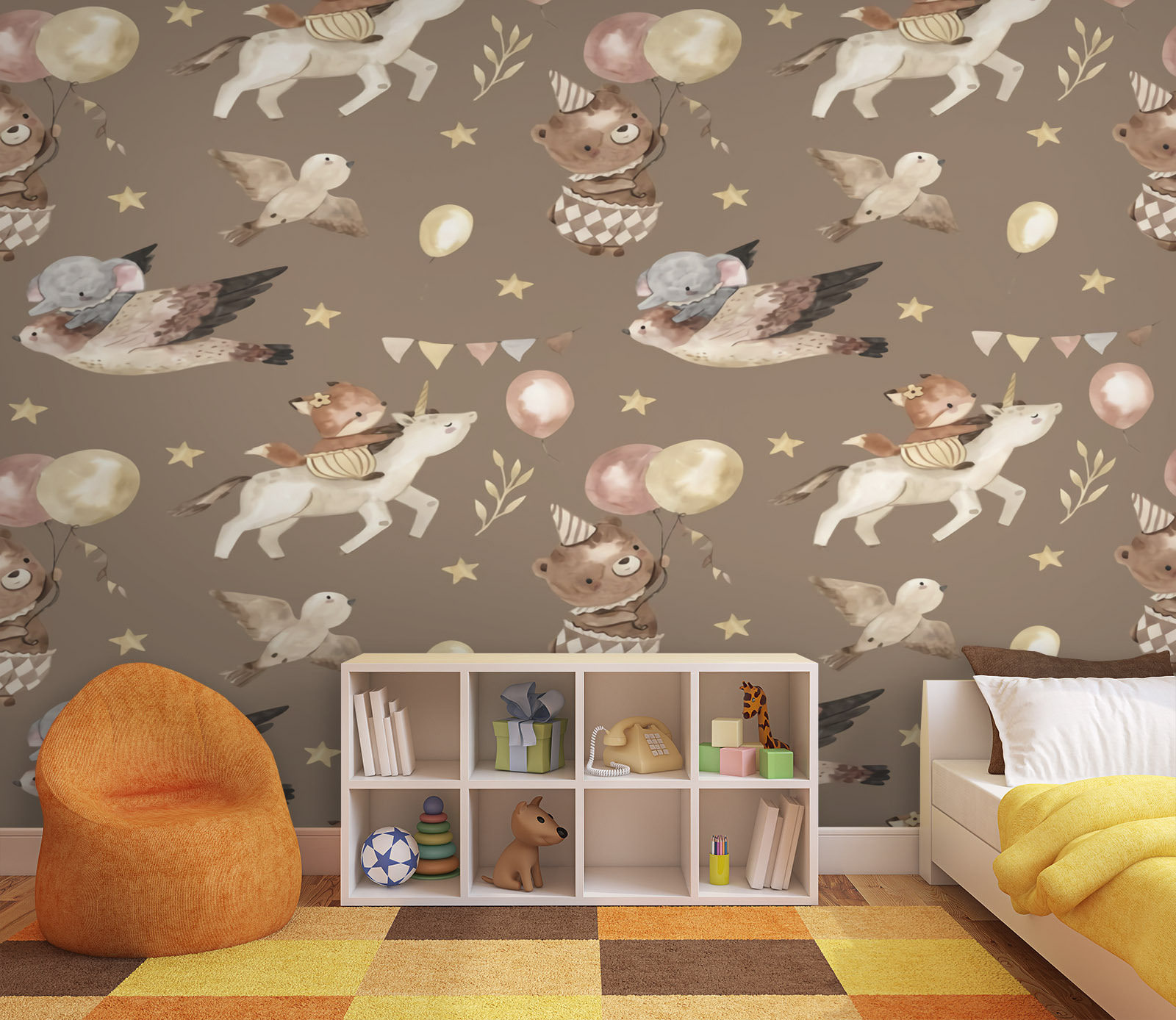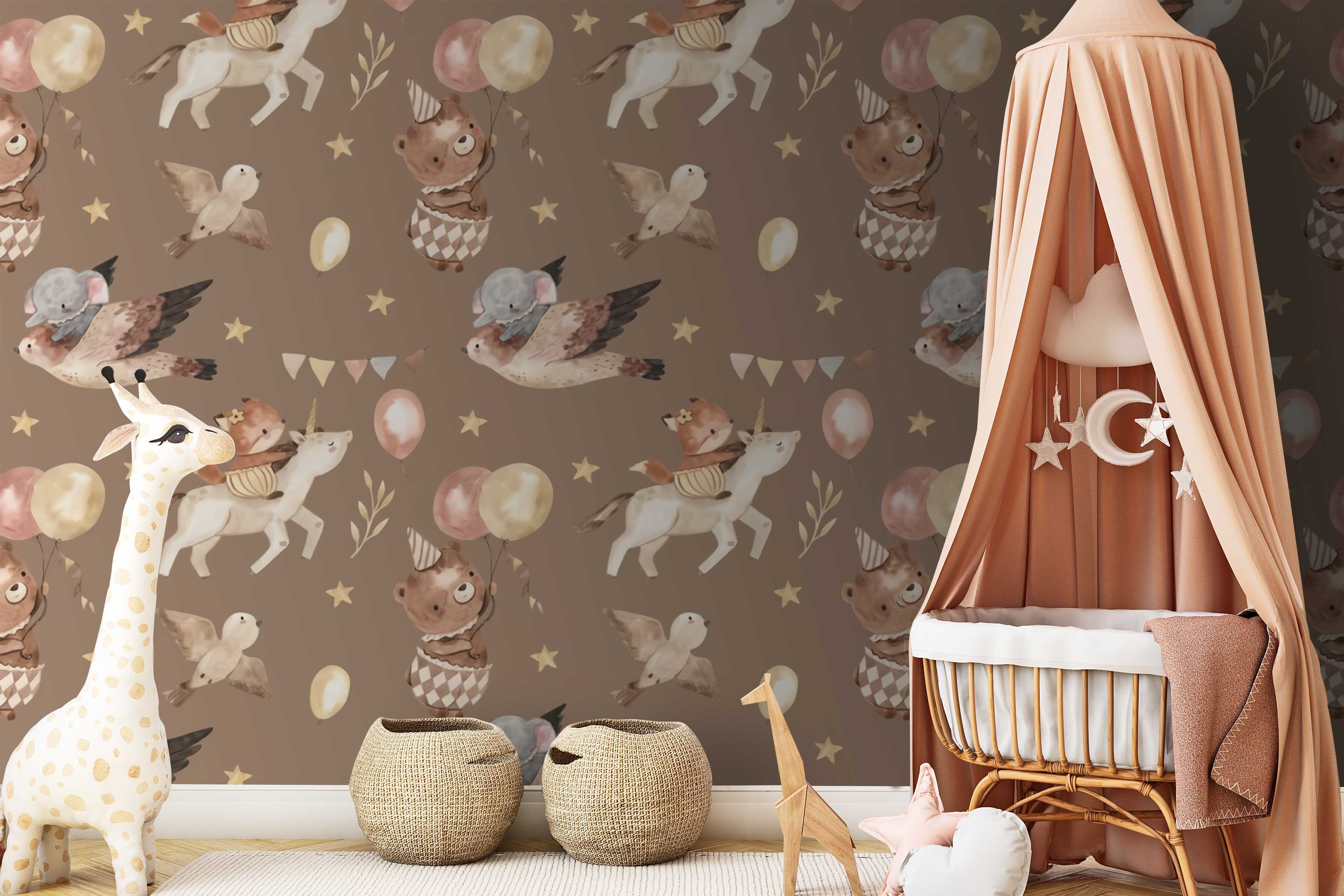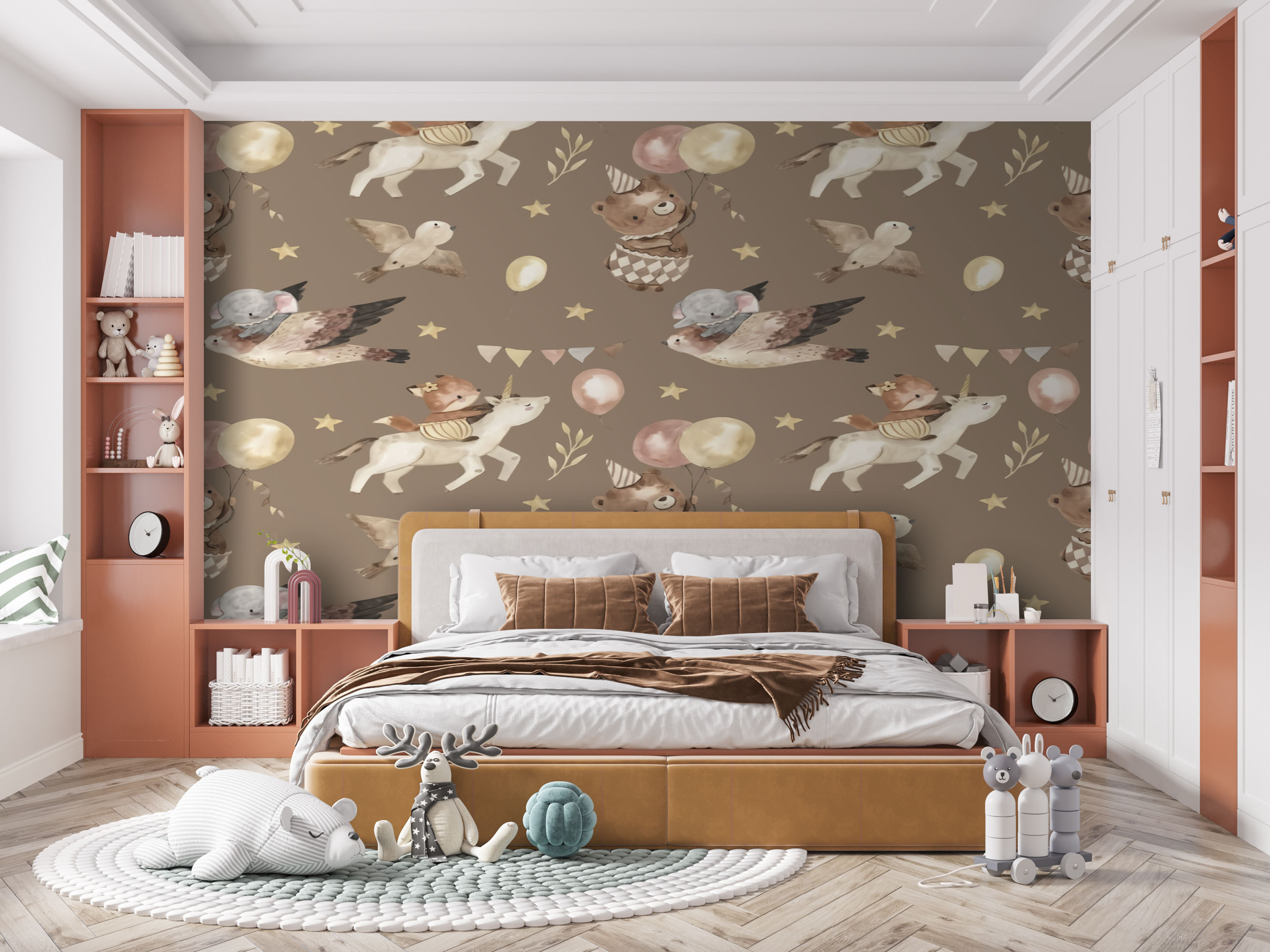 Tover elke kamer om in een grillig wonderland met deze charmante muurschildering met speelse dieren en kleurrijke ballonnen. Stel je voor dat je een ruimte binnenloopt waar een beer ballonnen vasthoudt, terwijl een kleine olifant een ritje deelt met een vrolijke vogel. Het is net een feestje waar elk beestje is uitgenodigd – hoe leuk is dat? Deze muurschildering voegt een vleugje verbeelding toe en zorgt voor een vrolijke en verhalende sfeer. Perfect voor kinderkamers of elke andere ruimte die wel een dosis vrolijkheid kan gebruiken. Dus of het nu een gezellig hoekje is of een speelse speelkamer, deze muurschildering zal zeker voor een glimlach en een gevoel van avontuur zorgen!