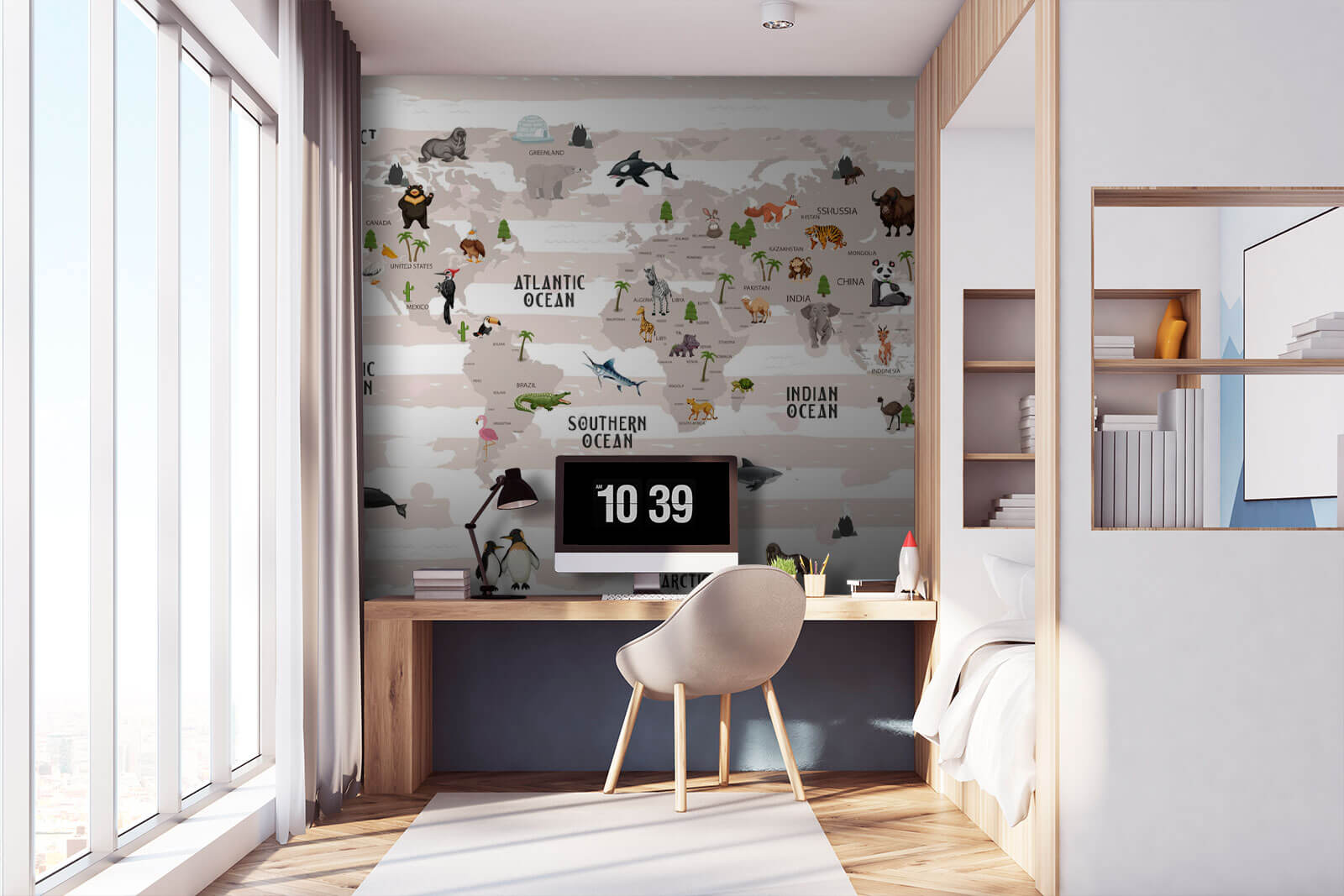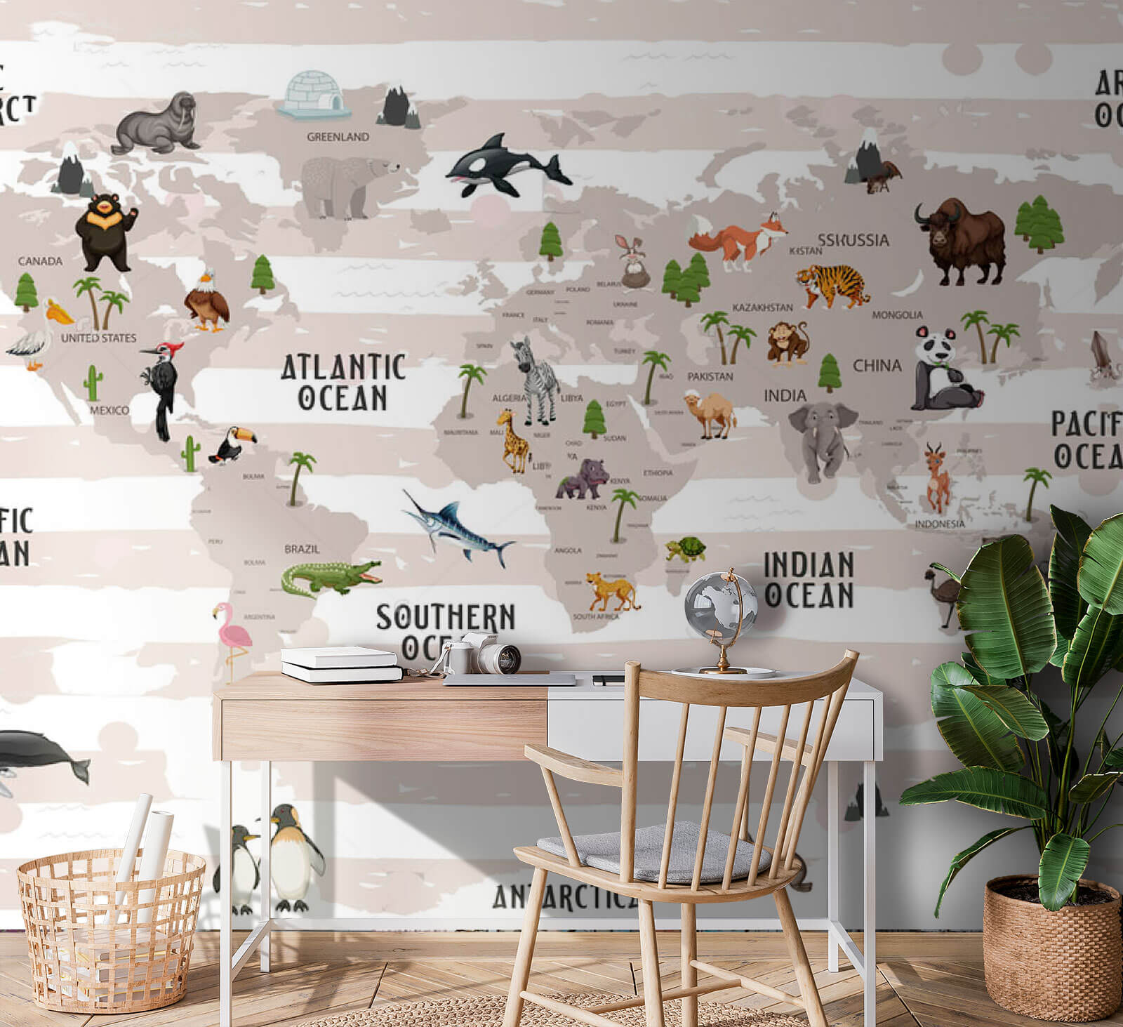 Transform any room into a miniature global adventure with this enchanting wall mural, featuring a world map adorned with delightful animals. Imagine waking up to a smiling panda in one corner and a majestic lion in another—what a way to start the day! The playful illustrations spark curiosity, making it a fantastic focal point for kids’ rooms or even a quirky spot in a home office. Plus, it’s a neat conversation starter; guests can “travel” the world without all that pesky packing. It’s like having a safari on your wall—without the bugs! Perfect for those who dream big and explore often, this mural brings a touch of whimsy to everyday life. Let the adventure begin!