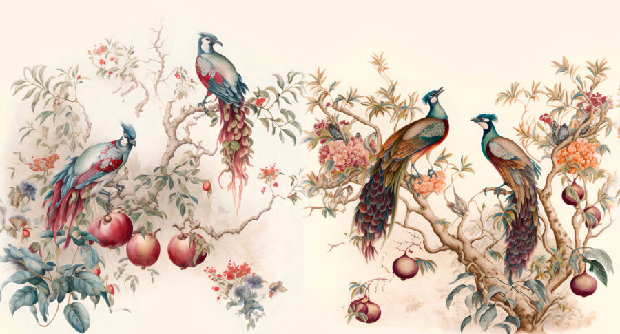 Transformeer je ruimte met deze prachtige muurschildering met levendige pauwen die sierlijk neergestreken zijn in weelderige bomen. Stel je voor dat je een grillige tuin binnenstapt telkens als je de kamer binnenkomt. De opvallende kleuren en ingewikkelde details voegen een vleugje persoonlijkheid toe, waardoor het meer is dan alleen decor – het is een conversatiestarter. Vrienden vragen je misschien of je stiekem een groene vingers hebt of de artistieke wereld aan het verkennen bent. Stel je gezellige avonden voor met zacht licht dat weerkaatst op de muurschildering en uitnodigt tot ontspanning en inspiratie. Het is bijna alsof de pauwen wachten om mee te gaan op je volgende avontuur. Wie zou er niet tussen zulke schoonheid willen wonen?