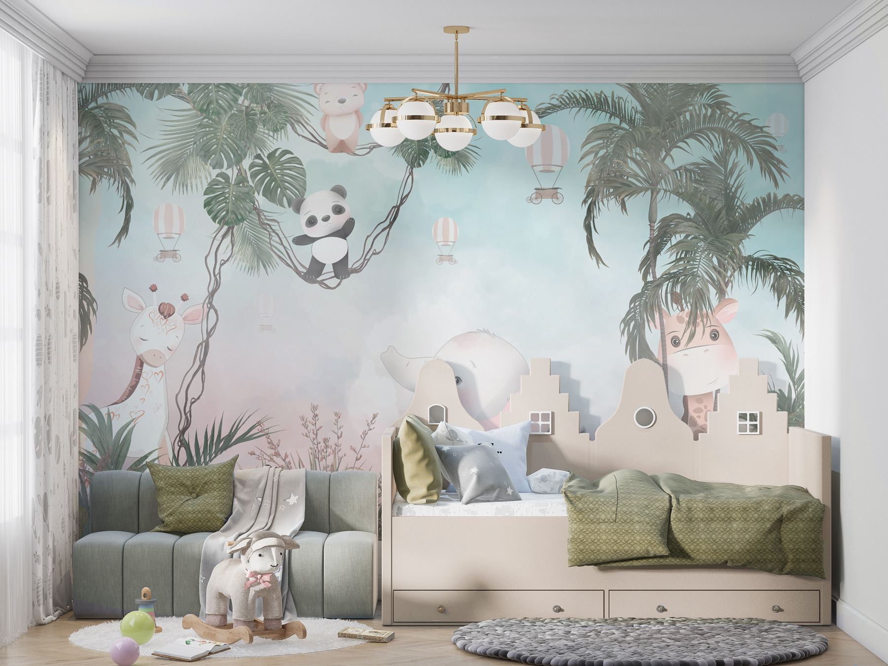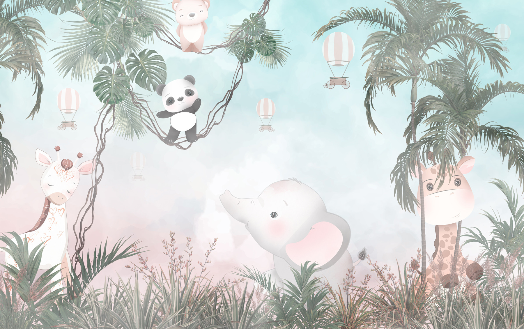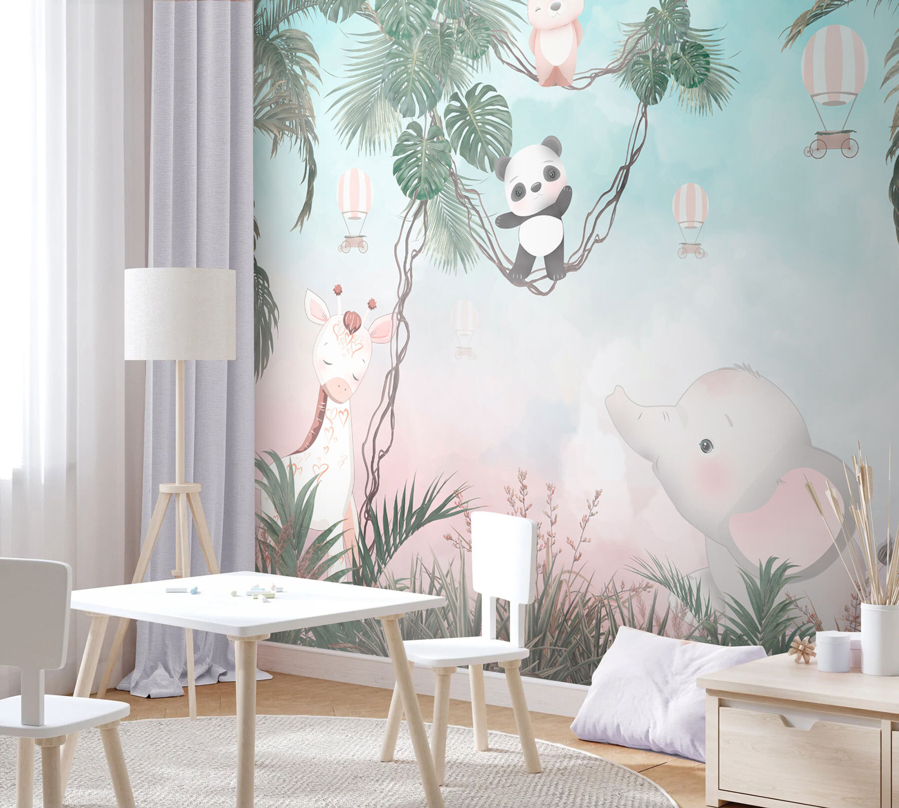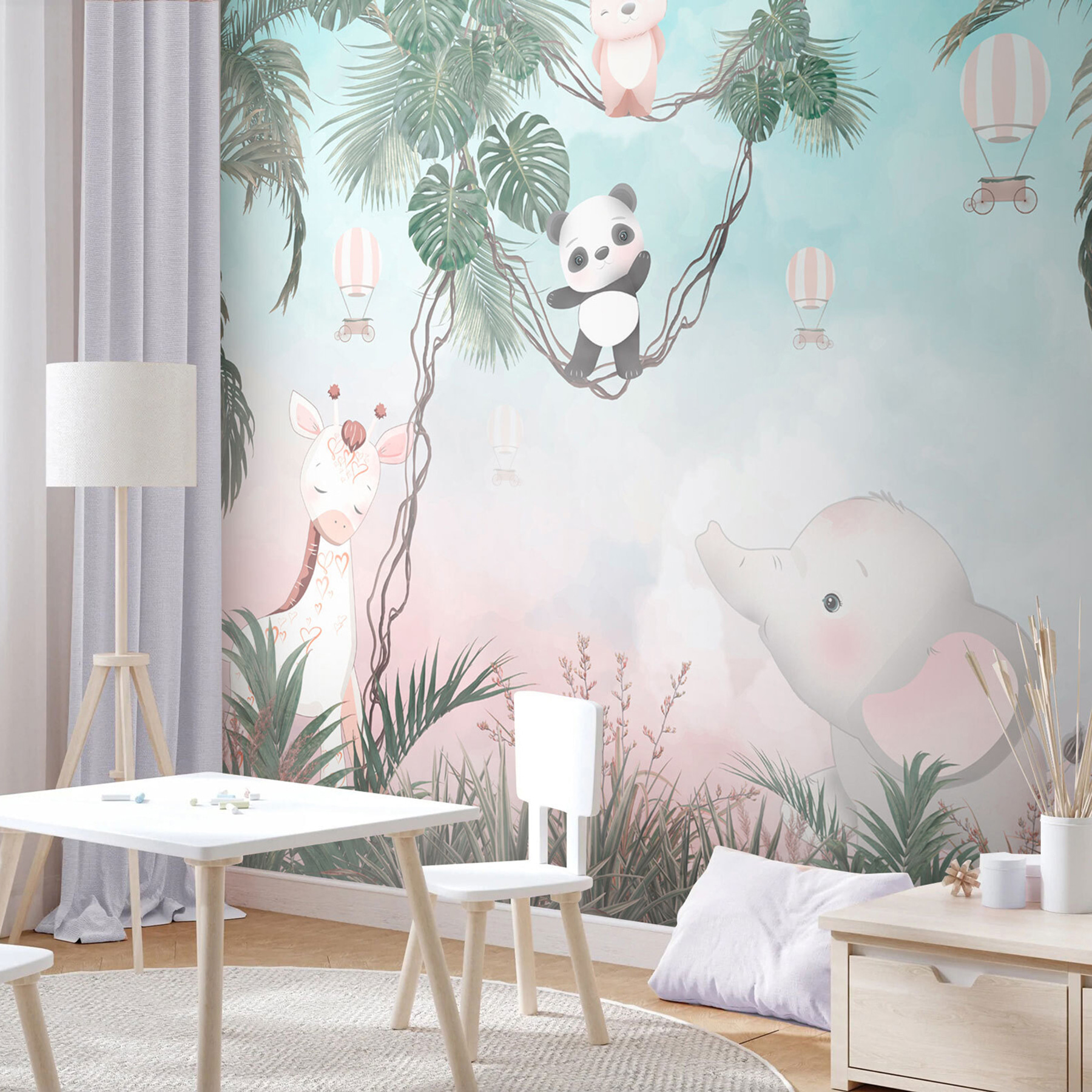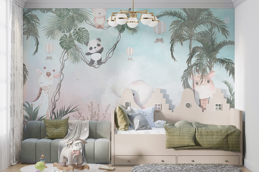 Tover elke saaie muur om in een avontuur met deze muurschildering met een speelse cartoonpanda die gewoonweg te schattig is. Stel je voor: een knusse kinderkamer waar je kleintje door de bomen kan slingeren samen met een vriendelijke panda en een olifant die klaar staat om zachtjes te giechelen. De zachte kleuren creëren een rustgevende achtergrond, perfect voor dutjes of verhaaltjes. Het is alsof je thuis in de jungle bent. Stel je die glimlach eens voor als gasten binnenkomen en dit vrolijke tafereel zien – het nodigt bijna uit tot vreugde en verbeelding in de kamer. Het is een gemakkelijke manier om een ruimte te laten aanvoelen als een mini-safari!