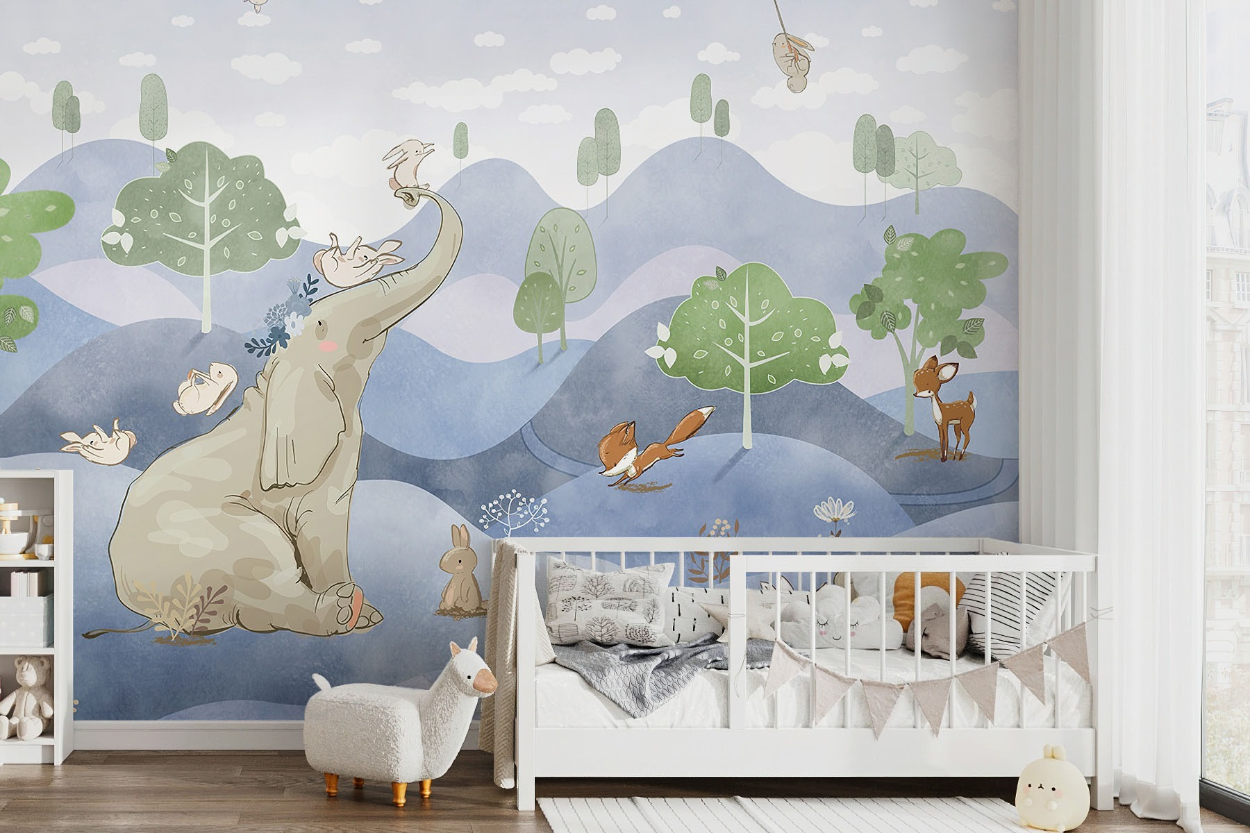 Stel je voor dat je de kinderkamer omtovert in een grillig wonderland met deze speelse muurschildering. Met een schattig konijn dat een bloem vasthoudt, vergezeld door een vrolijke cast van beestjes zoals een olifant, vos en hert, komt het rechtstreeks uit een sprookjesboek. De pastelkleuren en het dromerige landschap brengen een gevoel van rust en vreugde – perfect om de verbeelding van kleine kinderen aan te wakkeren. Stel je voor dat verhaaltjes voor het slapengaan tot leven komen of dat je ‘s middags wegdroomt. Laat deze muurschildering elke ruimte opfleuren en een magisch toevluchtsoord creëren waar avontuur en rust samengaan.