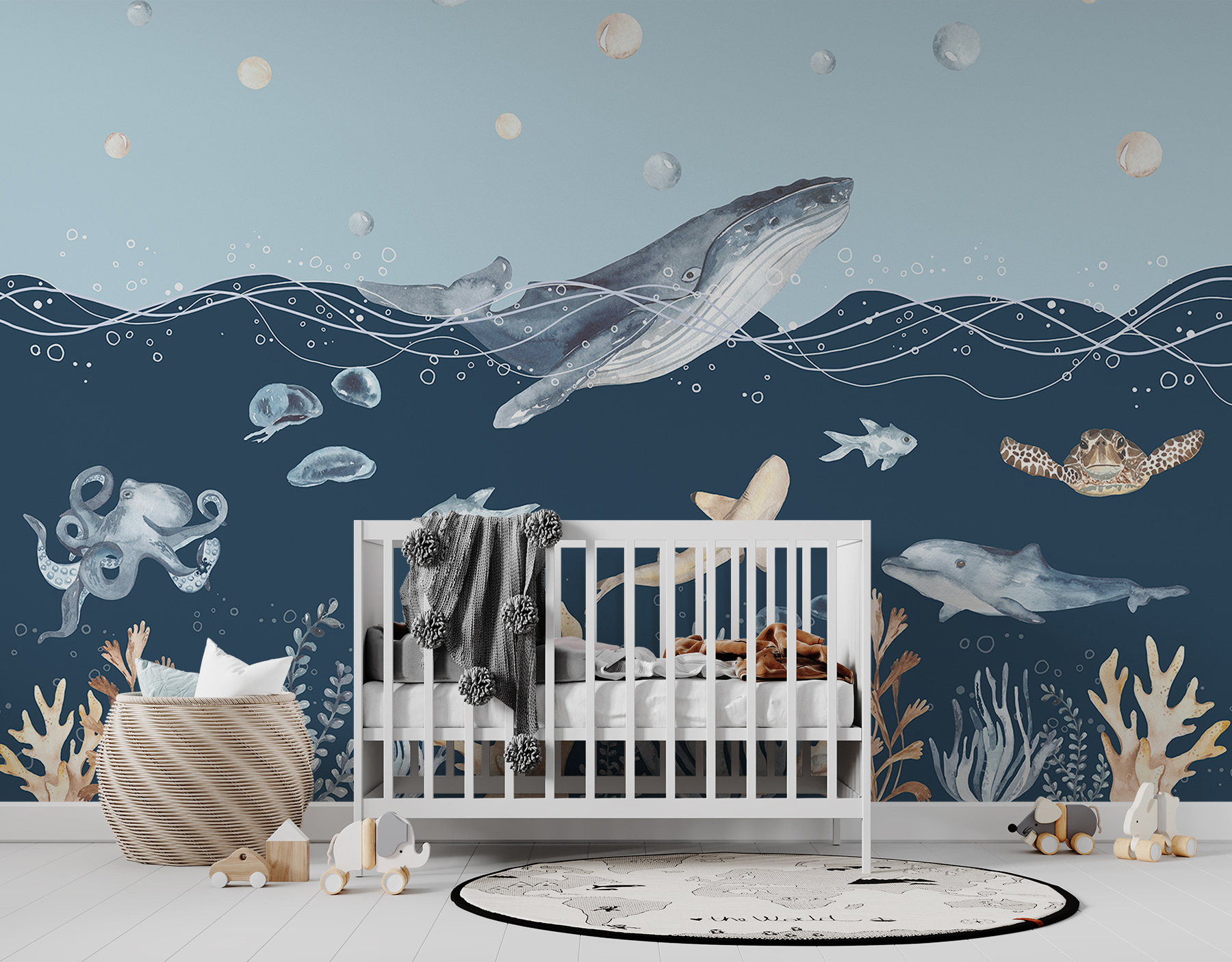 Denk er maar eens over na: een sierlijke walvis die door de diepte glijdt, omringd door vrolijke vissen en kleurrijke koralen. Het is alsof je een stukje zee in huis haalt. Het is rustgevend en grillig tegelijk, een perfecte achtergrond voor verhaaltjes voor het slapengaan of avontuurlijke speeltijd.