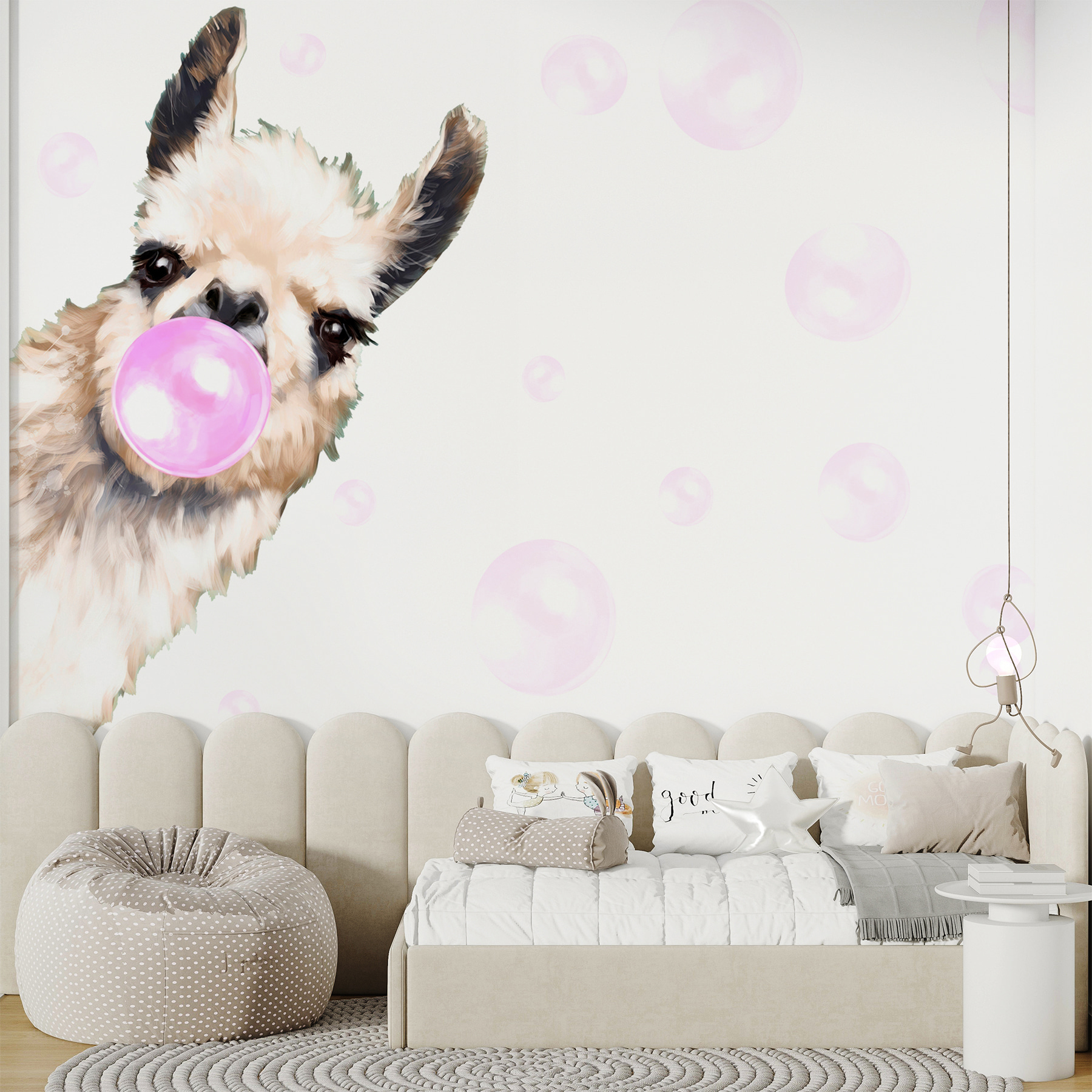 Stel je voor dat je een kamer binnenloopt en begroet wordt door een lama die een roze bel blaast – dat is meteen leuk! Deze muurschildering is niet alleen decor; het is alsof je een eigenzinnige vriend aan de muur hebt. De muurschildering is perfect voor de kamer van een dochter of tiener en geeft die speelse geest weer die een glimlach op je gezicht tovert. De zachte kleuren en het grillige ontwerp voegen een luchtige sfeer toe en creëren een ruimte die levendig en toch gezellig aanvoelt. Stel je de vreugde en het gegiechel eens voor tijdens een filmavondje. Het is niet zomaar een muur; het is een ervaring die staat te gebeuren. Perfect voor iedereen die een beetje vrolijkheid in zijn ruimte wil brengen.
