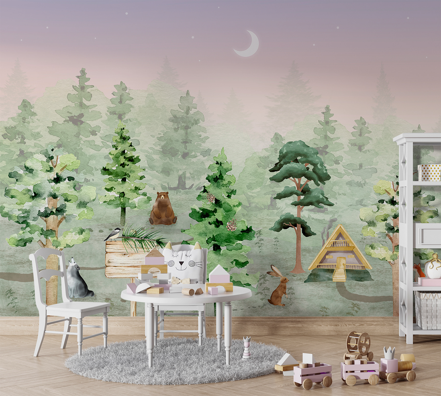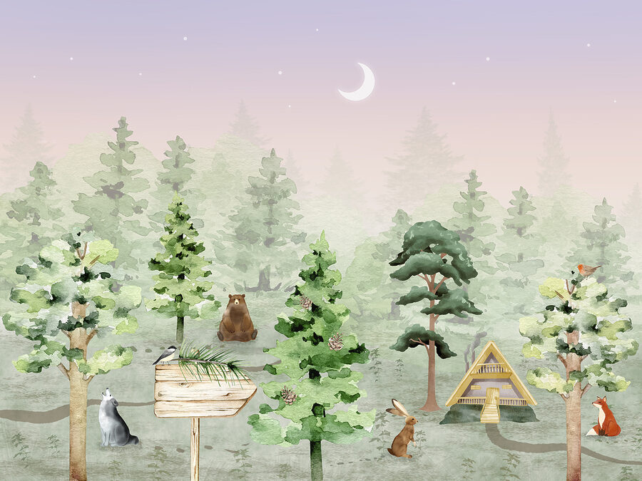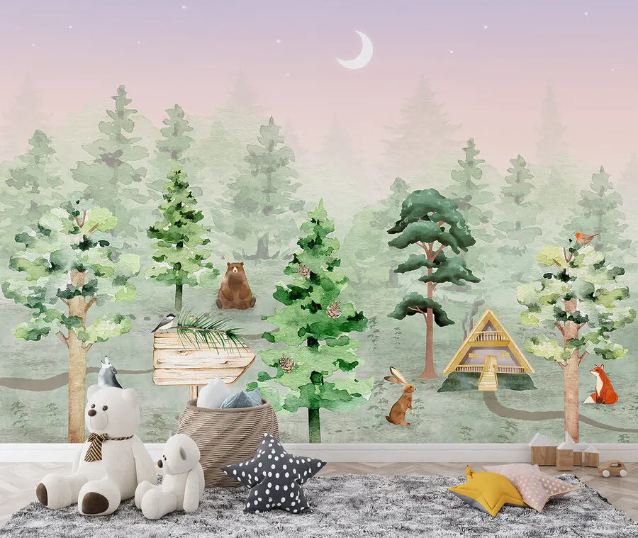 Stel je eens voor: een magisch bos bij jou thuis. Op deze mooie muurschildering zit een schattig vogeltje op een houten bord, dat je uitnodigt in een grillig boslandschap. Dierenvrienden komen om je heen staan en voegen elk een vleugje charme en avontuur toe. Perfect voor kinderkamers, het is alsof je elke dag in een geliefd verhalenboek stapt. Door de zachte, rustgevende kleuren voelen de dieren aan als vriendelijke metgezellen. Kinderen zullen de vos, het konijn en de wijze oude beer graag zien als ze in slaap vallen. Het maanlicht voegt een vleugje betovering toe, waardoor bedtijd nog magischer wordt. Het is niet zomaar een muurschildering, het is een reis naar een dromerig bos dat de verbeelding en liefde voor de natuur in jonge harten aanwakkert. Wie zou dit kleine wonder niet aan de muur willen hebben?
