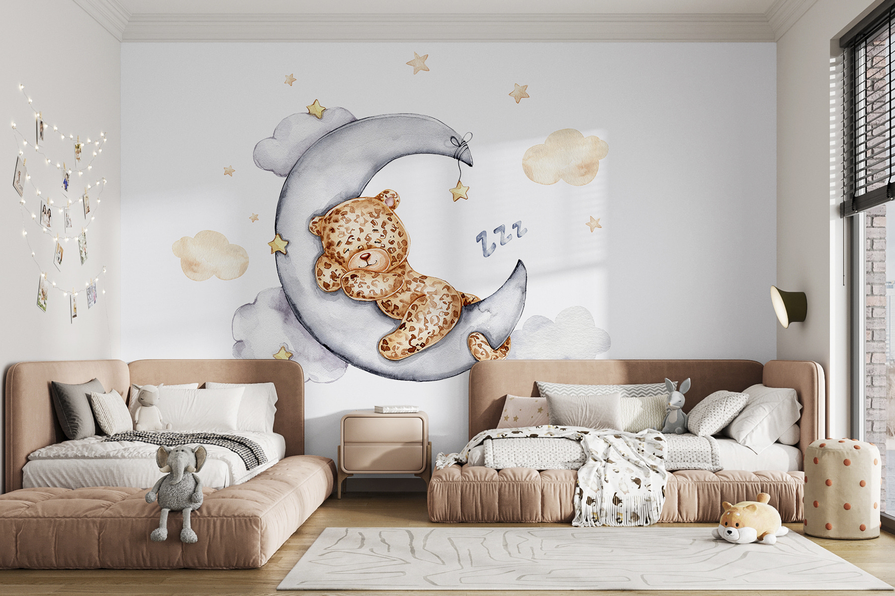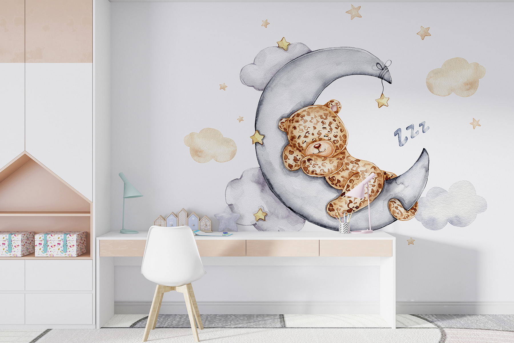 Stel je voor dat je omhoog kijkt en een schattige teddybeer ziet die lekker ligt te slapen op de maan! Deze muurschildering “Teddybeer slaapt op de maan” is precies wat je nodig hebt om een beetje magie toe te voegen aan elke kinderkamer. Het is perfect voor kinderkamers die een vleugje eigenzinnigheid kunnen gebruiken. Stel je die dromerige, rustige nachten voor met deze lieve beer die de wacht houdt. De zachte kleuren en het speelse ontwerp maken bedtijd gezellig en betoverend. Echt waar – het is als een warme knuffel voor aan de muur! Iedereen die hem ziet, zal glimlachen. Bovendien is het een geweldige gespreksstarter voor elke kamer. Zo’n charmante touch die pure vreugde toevoegt!