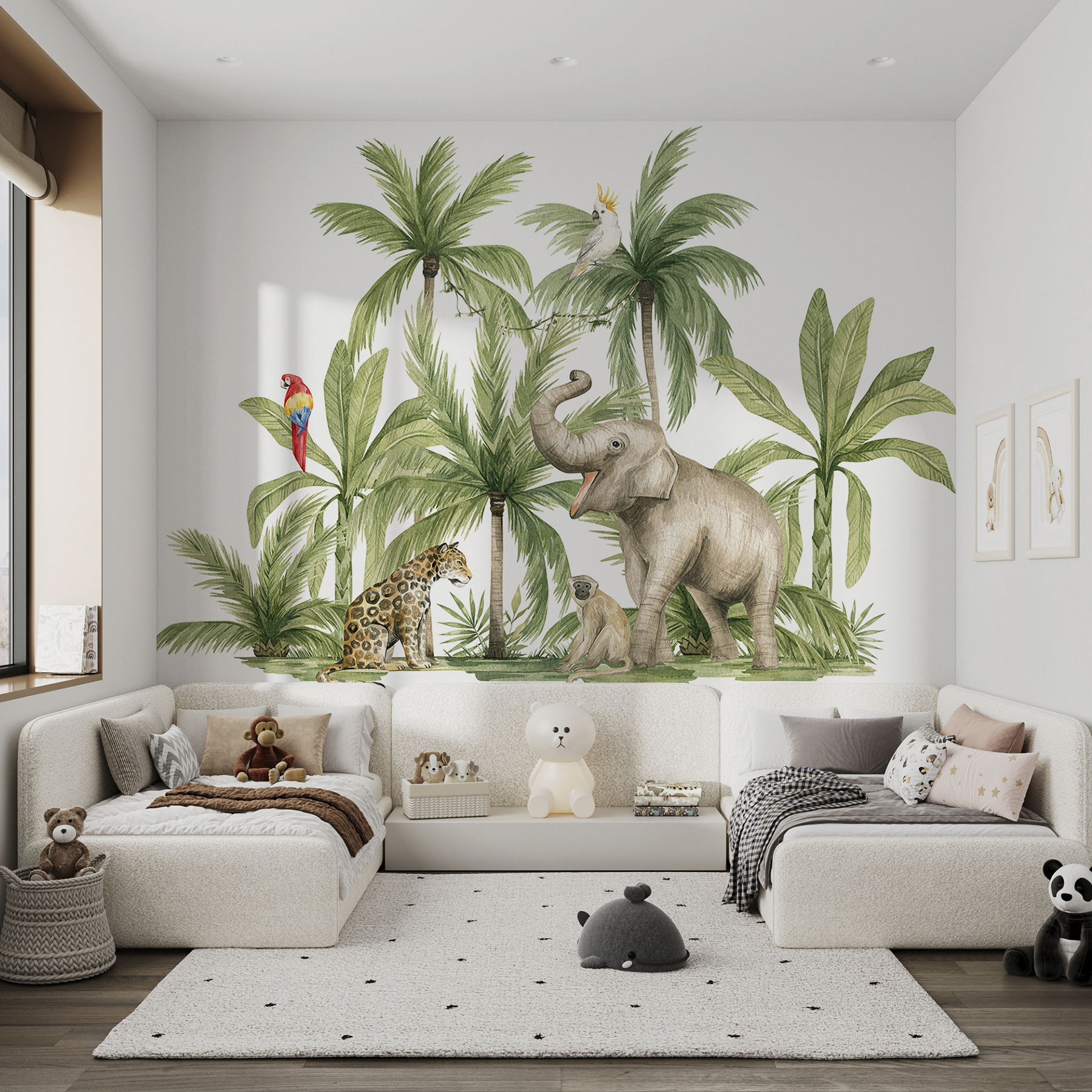 Tover elke kamer om in een levendig jungleavontuur met deze grillige muurschildering met speelse dieren tussen wuivende palmbomen. Stel je voor dat je een ruimte binnenloopt waar een olifant, een brutale aap en een kleurrijke papegaai je begroeten – wie zou daar niet om glimlachen? Perfect voor kinderkamers of zelfs een gezellig hoekje in je woonkamer, het voegt een vleugje charme van de natuur toe. En wie kan de rustgevende sfeer van weelderig groen weerstaan? Leun achterover en laat deze jungle scène vreugde en gelach opwekken, waardoor alledaagse momenten in mini-avonturen veranderen. Omarm de wilde kant, al is het maar voor even!