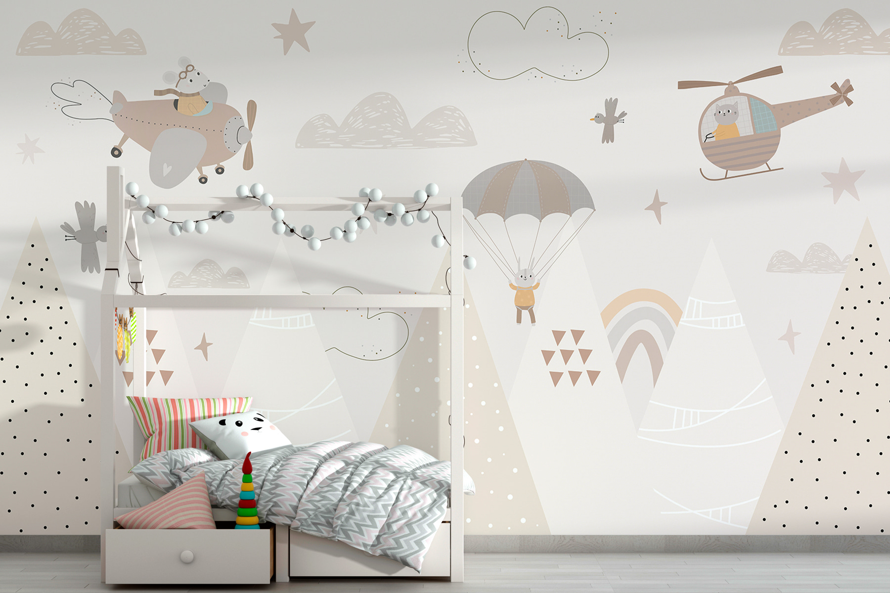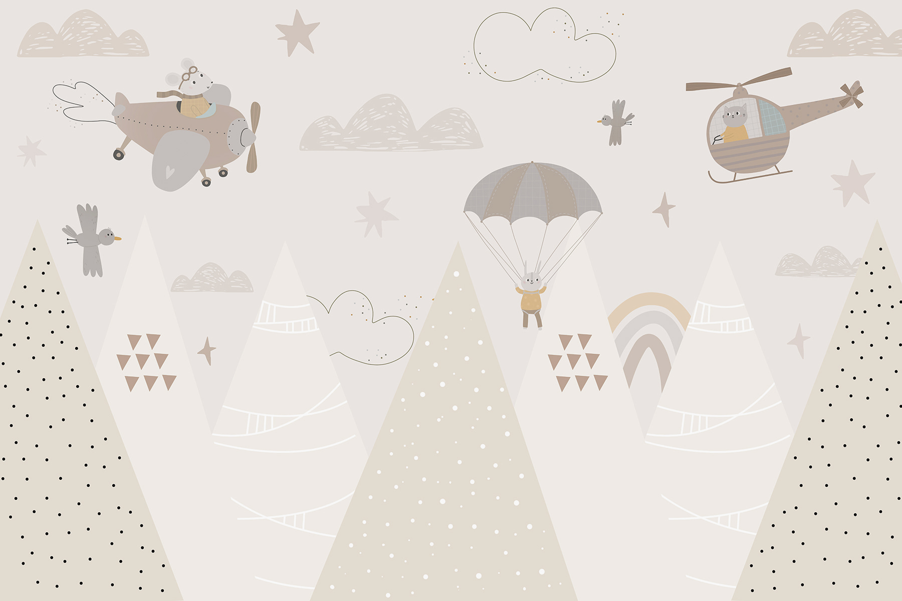Subtiele pastelkleuren en speelse details voegen overal waar je kijkt magie toe – wolken, sterren en zelfs een parachuterend konijntje! Je kunt het zachte suizen van de wind en het vrolijke getjilp van vogels bijna horen. Het zou perfect zijn om kleine fantasieën aan te wakkeren en verhaaltjes voor het slapengaan om te toveren in grootse verhalen over avonturen in de lucht.