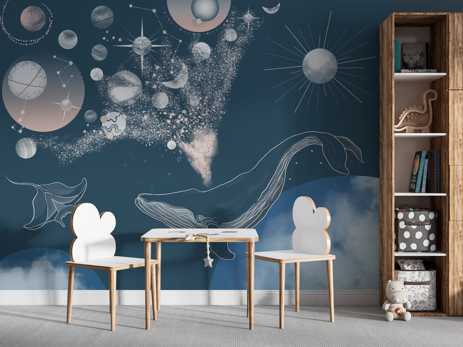 “Fotobehang Moon and the Moon” is een van die stukken die je meteen in een droom brengen. Stel je voor dat je kamer een onderwater plek wordt om sterren te kijken. Ja, dat klopt. Op deze muurschildering zie je een majestueuze walvis die door een kosmisch tafereel vaart met planeten, sterren en maanfasen in het rond – het is alsof de oceaan het universum ontmoet! Perfect om een vleugje magie toe te voegen aan elke ruimte. Gasten kunnen zichzelf verliezen in het natrekken van sterrenbeelden en zich het verhaal achter elk hemellichaam inbeelden. Het is een gespreksstarter, een showstopper en een gezellig toevluchtsoord in één. Duik erin en laat je muren een grillig verhaal vertellen!