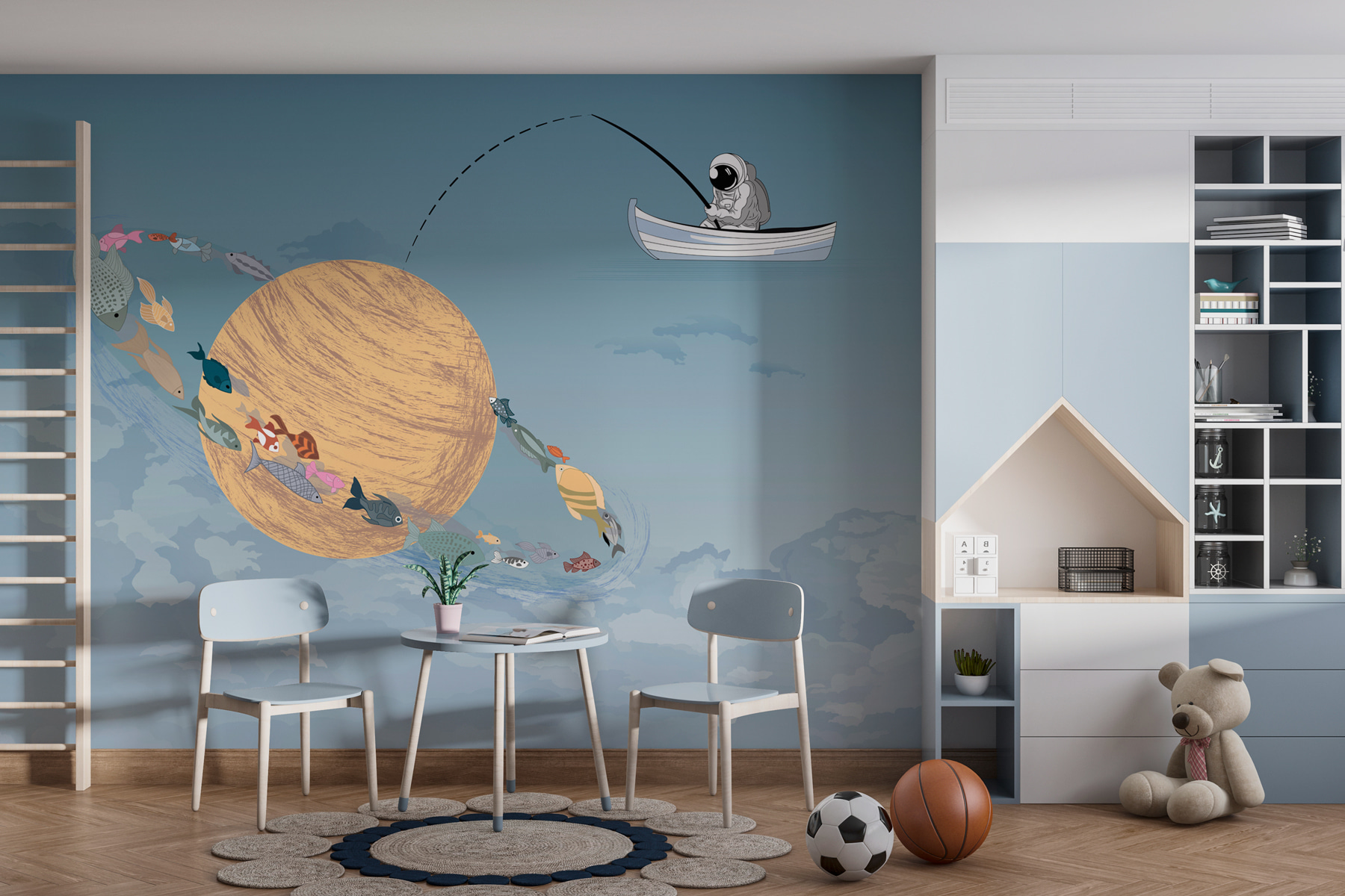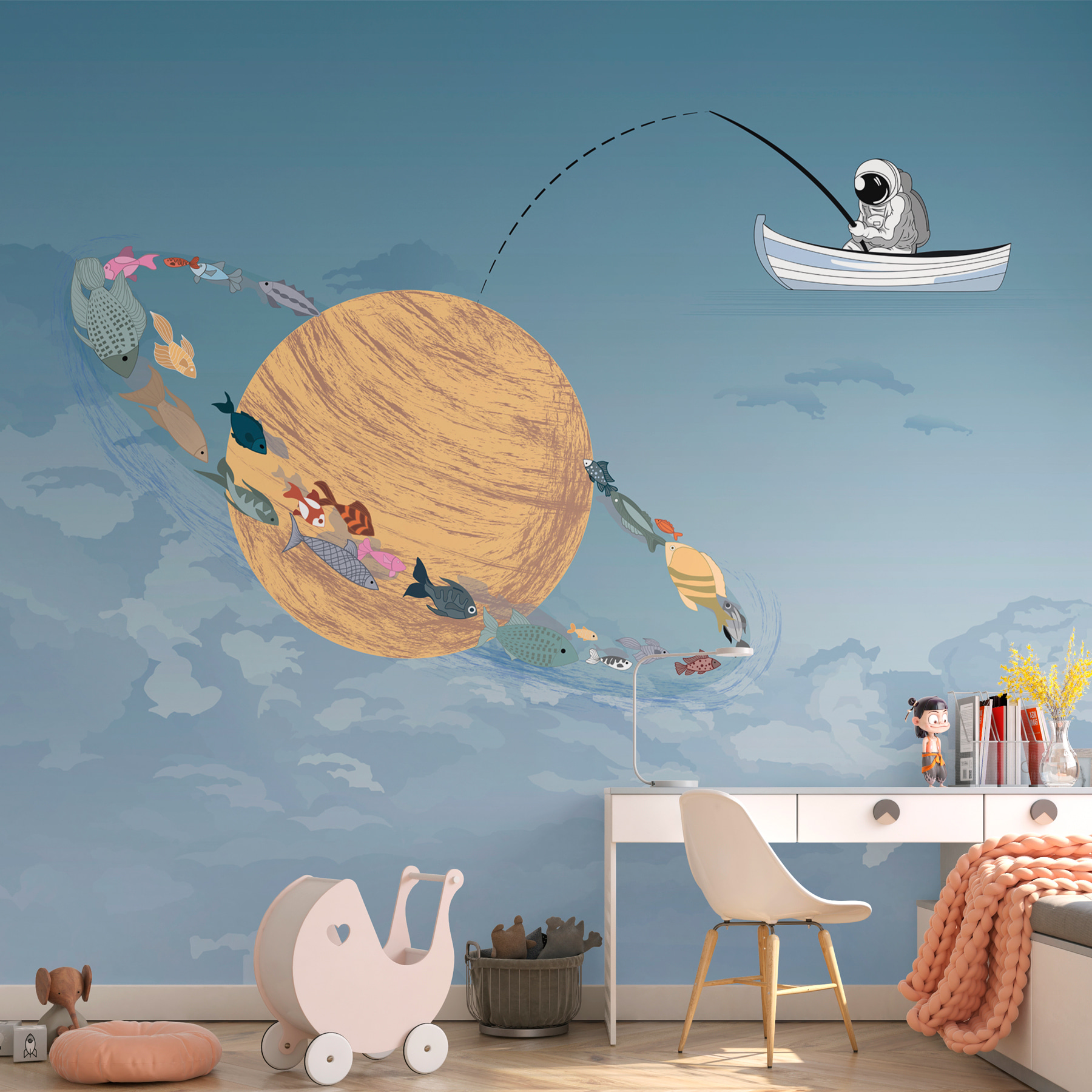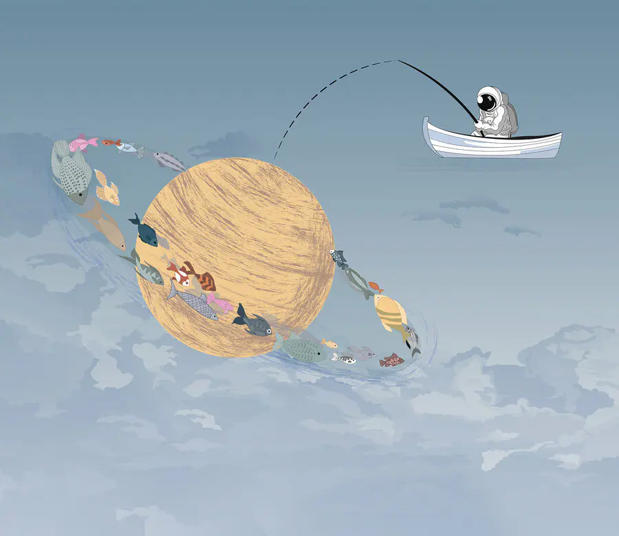 Stel je een gezellig visreisje voor, maar in plaats van een rustig meer zweef je in de wolken. Deze muurschildering brengt die droom tot leven. Stel je een grillig tafereel voor van een man in een boot, vissend in de lucht, met kleurrijke vissen die rond een reusachtige wervelende planeet zwemmen. Helder blauw en zacht wit creëren een serene sfeer, perfect om bij weg te dromen. Het is alsof er een geheim avontuur boven je hoofd wacht. Perfect voor een kinderkamer of een creatieve ruimte, het prikkelt de verbeelding en geeft een leuke draai aan elke muur. Wie zou er geen lijntje in de wolken willen gooien?