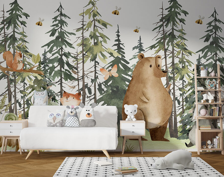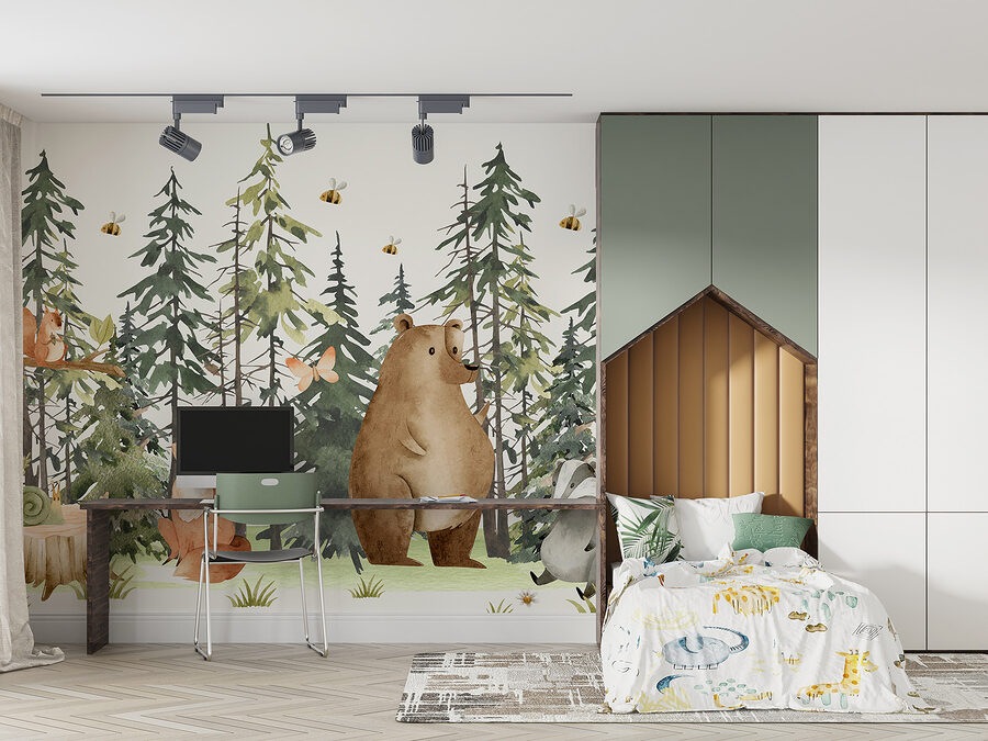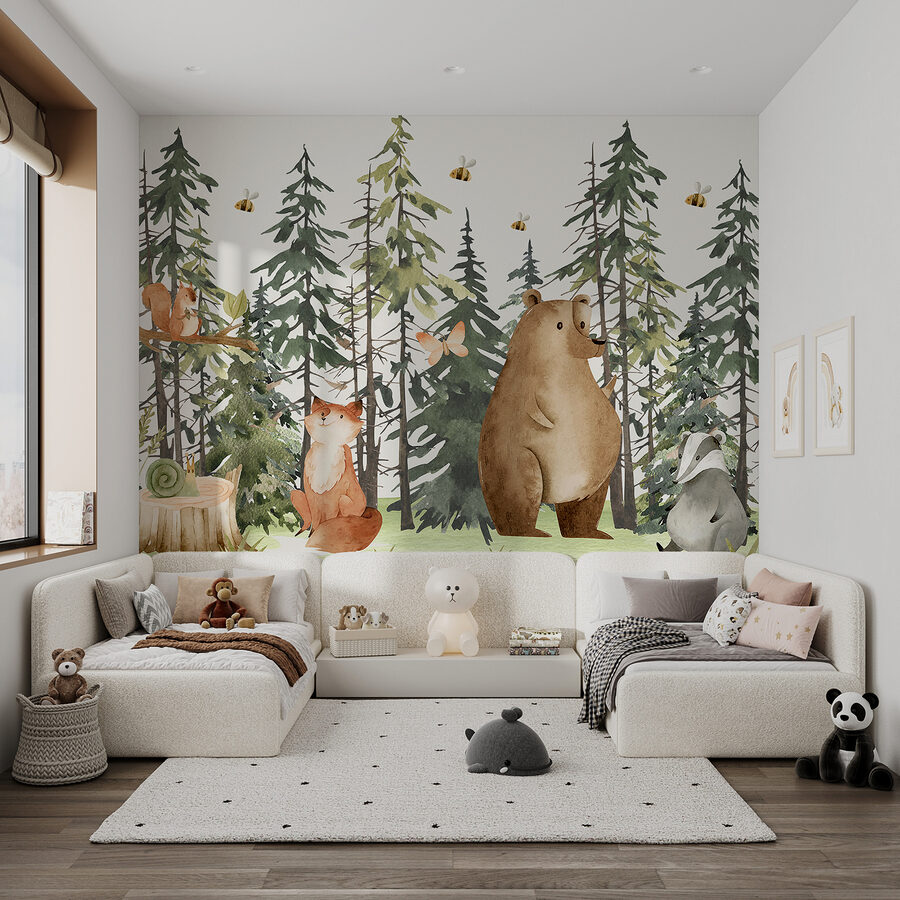 Tover elke ruimte om in een grillig wonderland met deze charmante muurschildering met een heerlijke slak die op een knusse boomstronk zit. Stel je voor: warm zonlicht dat door hoge dennenbomen naar binnen valt, terwijl kleine beestjes zoals vossen en beren bij je op de thee komen – nou ja, figuurlijk dan! De zachte kleuren en schattige wilde dieren geven een magische sfeer die zelfs de drukste geesten kan kalmeren. Stel je voor dat je wakker wordt met dit vrolijke tafereel en je meteen omringd voelt door de natuur. Het is alsof je een stukje bos in huis haalt, perfect voor kinderkamers of andere plekken die een vleugje betovering nodig hebben. En misschien inspireert het wel tot heerlijke dagdromen!