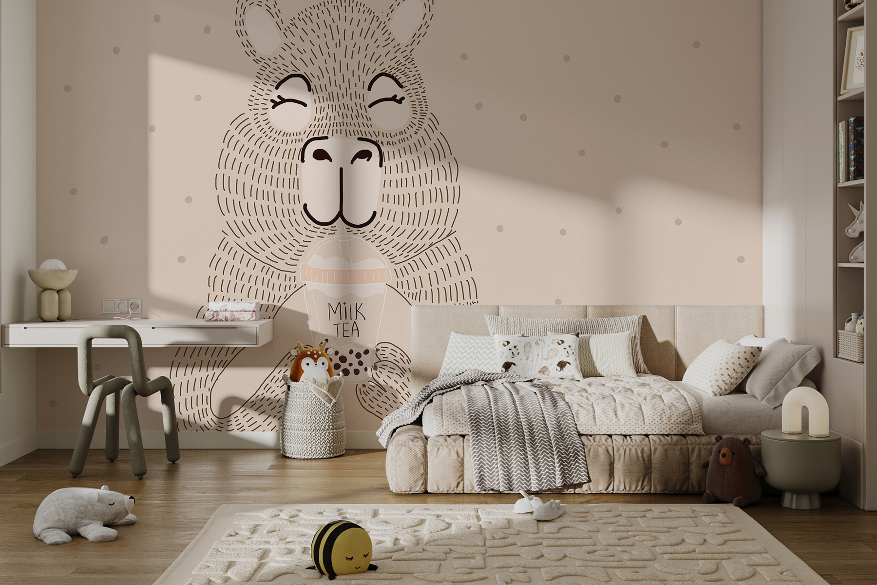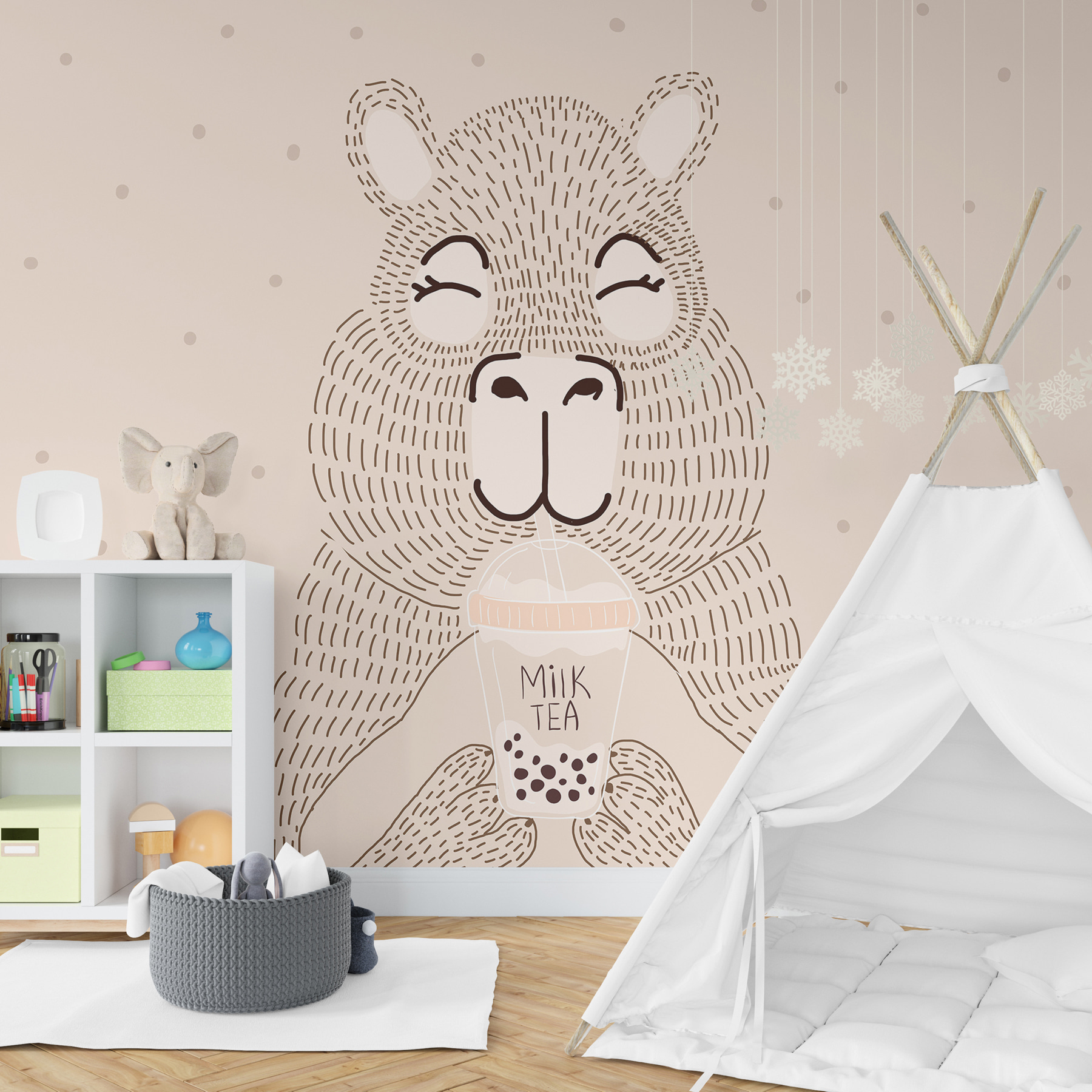 Transformeer je kamer met deze charmante muurschildering van een beer die zalig geniet van bubbelthee – het is alsof je een grillig verhaal op je muur krijgt. Deze muurschildering is perfect om een vleugje speelse gezelligheid toe te voegen aan elke kamer en combineert schattig en eigenzinnig op de beste manier. Stel je voor dat je wakker wordt met deze vrolijke beer die sneller een glimlach op je gezicht tovert dan je ochtendkoffie. Vrienden en familie zullen dol zijn op zijn eenvoudige charme. Het is niet alleen decor; het is een dagelijkse herinnering om te genieten van de simpele geneugten van het leven, één bel tegelijk.