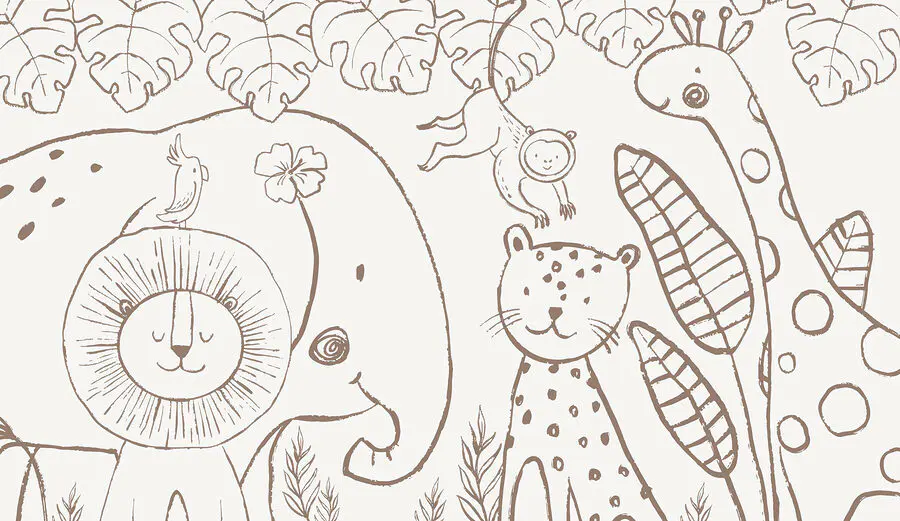 Stel je voor: een kindergezichtje dat elke ochtend oplicht als ze wakker worden met hun grillige, handgetekende vriendjes aan de muur. De rustgevende aardetinten vermengen zich met speelse lijnen die een gevoel van avontuur en rust brengen. En zeg nou eerlijk, wie wil er nou geen vrolijke leeuw met een vogel op zijn hoofd zien? Het is een gespreksstarter, een aansporing om verhalen te vertellen en een kunstwerk in één.