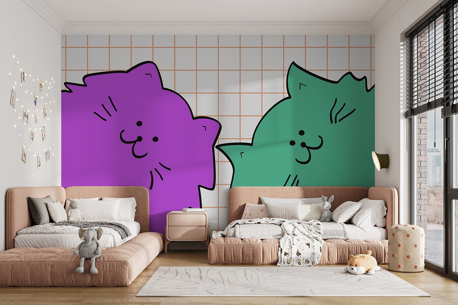 Stel je twee pluizige katten voor die op je muur loungen, geschilderd in heerlijke paarse en groene tinten. Deze muurschildering is niet alleen voor kattenliefhebbers; het is een vleugje eigenzinnigheid waardoor elke kamer aanvoelt als een gezellige schuilplaats. Stel je voor: je komt binnen na een lange dag en deze twee pastelkleurige poesjes begroeten je met hun vrolijke uitstraling. Het is alsof ze je toefluisteren: “Rustig aan, vriend”. Perfect voor een speelse woonkamer of een eigenzinnig caféhoekje, deze muurschildering is de ultieme conversatiestarter. En hé, geen kattenbak nodig!