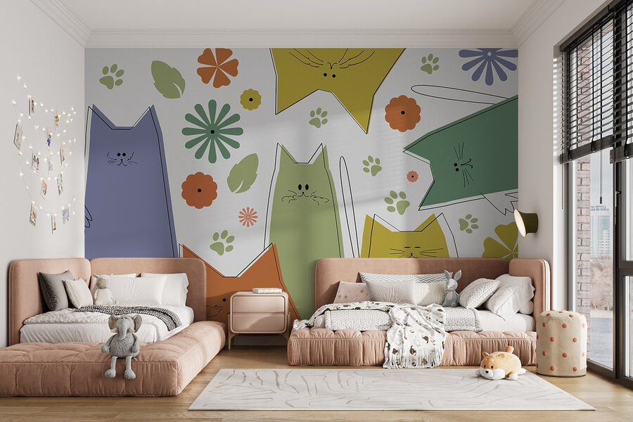 Breng een vleugje eigenzinnigheid in elke kamer met deze prachtige muurschildering met een eigenzinnige groep katten die dartelen tussen levendige bloemen en bladeren. Stel je die charmante gezichtjes voor die tevoorschijn gluren terwijl ze van muur naar muur springen, hun speelse energie fleurt je kamer op. Perfect voor kattenliefhebbers – wie wil er nou niet dat hun inrichting een beetje persoonlijkheid uitstraalt? Het is net alsof je een huisdier hebt zonder de kattenbak! Stel je gezellige avonden voor in een kattenparadijs, nippend aan een kopje thee en genietend van de fuzzy vibes. Deze muurschildering decoreert niet alleen, maar vertelt een verhaal van vreugde en speelsheid, waardoor elke ruimte als thuis voelt.