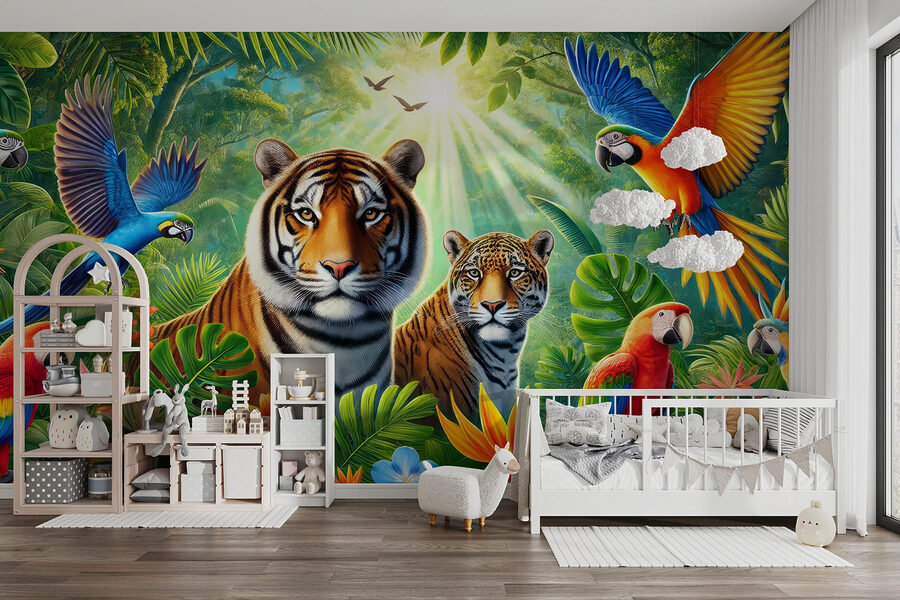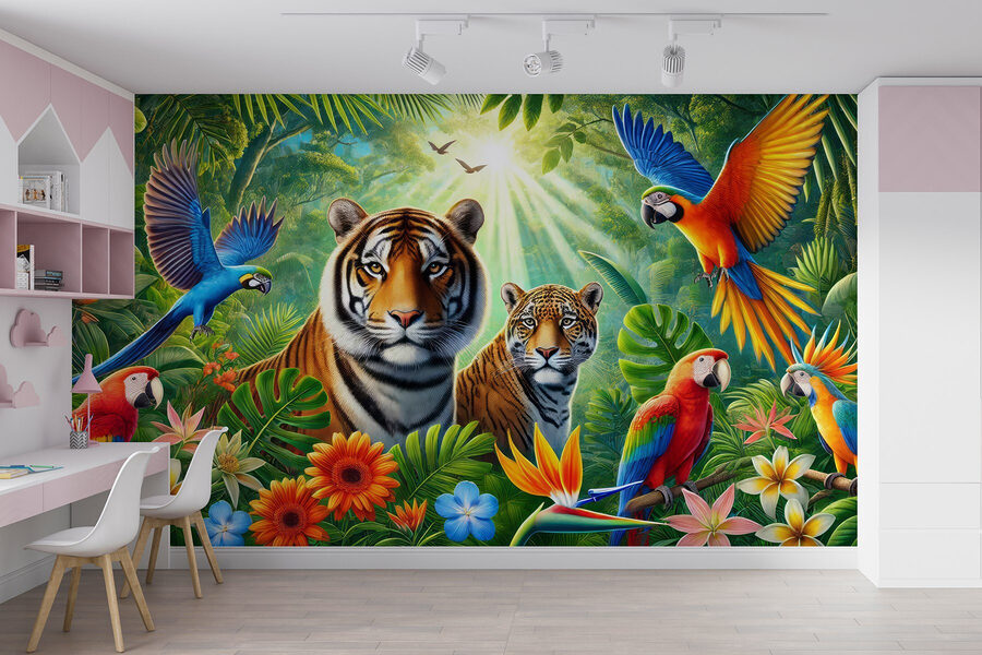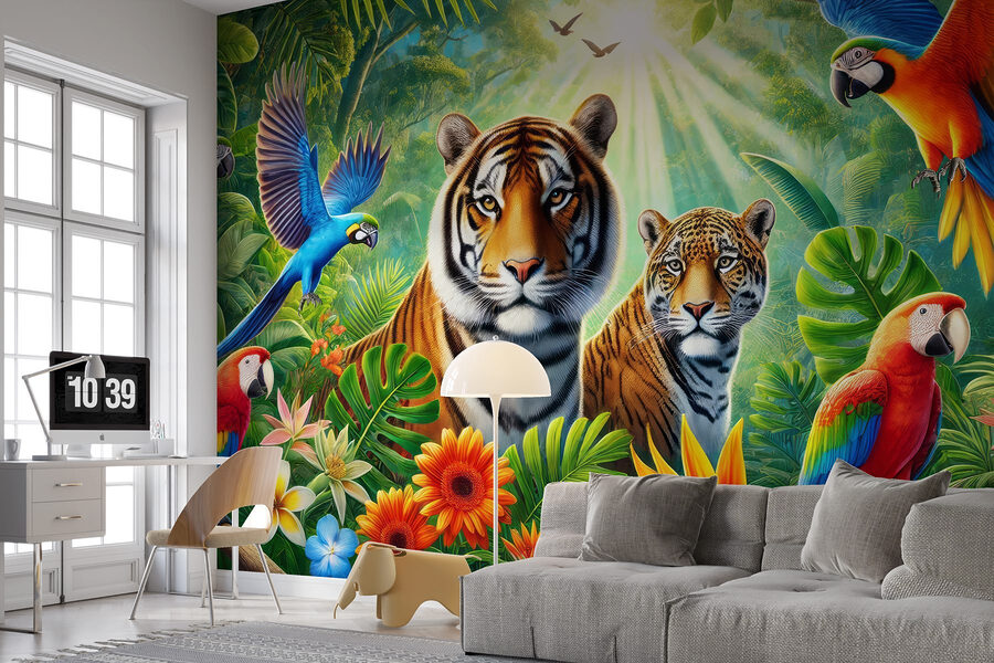 Duik in een junglewonderland met deze prachtige muurschildering! Stel je voor dat je thuiskomt in een levendige omgeving vol leven – tijgers zijn aan het chillen en kleurrijke papegaaien voeren een show op. Het is alsof je een avontuur in je woonkamer beleeft. Je kunt de geluiden van ritselende bladeren en speels gekrijs bijna horen. Plak deze muurschildering op je muur en plotseling voelt je ruimte als een weelderig toevluchtsoord, klaar voor een tropische vakantie op elk moment. Perfect voor wie van de natuur houdt of gewoon behoefte heeft aan een heldere vonk in huis. Serieus, wie zou er niet glimlachen elke keer als hij langsloopt? Het is een lust voor het oog!