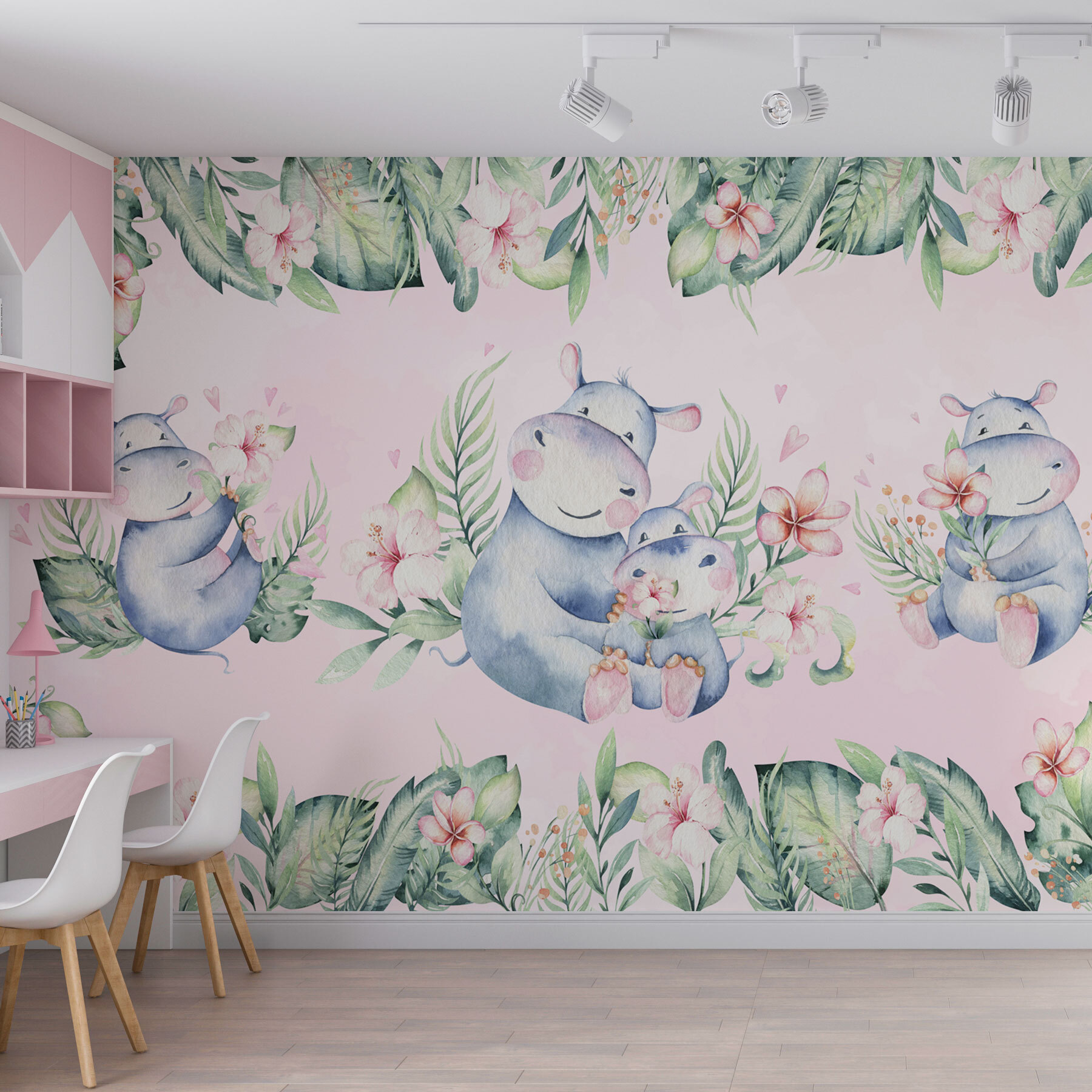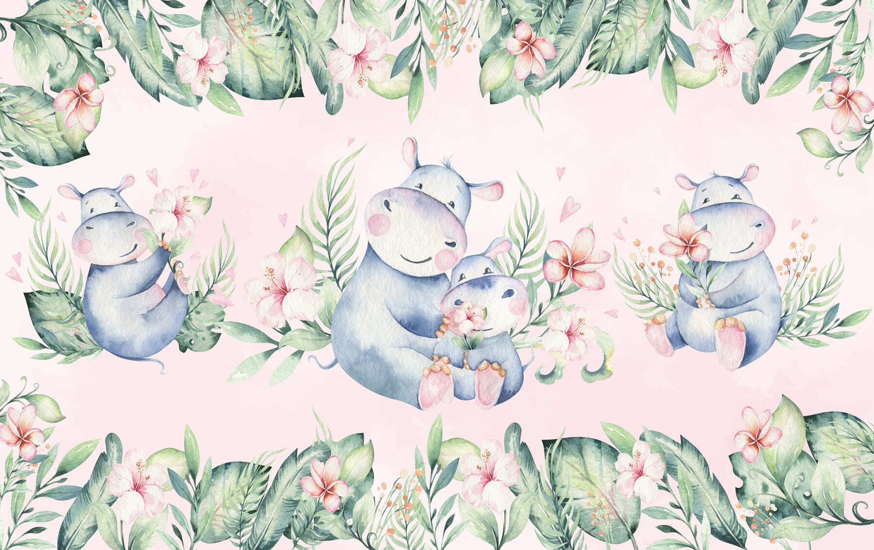 Transformeer je kamer met deze prachtige muurschildering met charmante waterverf nijlpaarden tussen levendige bloemen. Stel je voor dat je een kamer binnenloopt waar deze schattige wezens lijken te giechelen en de schoonheid van de natuur omarmen, waardoor je humeur meteen opfleurt. Perfect voor kinderkamers of speelse ruimtes, deze muurschildering voegt een vrolijke sfeer toe die vreugde fluistert. De rustgevende roze achtergrond zorgt voor een warm en uitnodigend gevoel. Het is alsof je een stukje savanne in huis hebt, waar elke blik een glimlach op je gezicht tovert – wie wil dat nou niet? Bovendien kan het inspireren tot leuke vertelmomenten!
