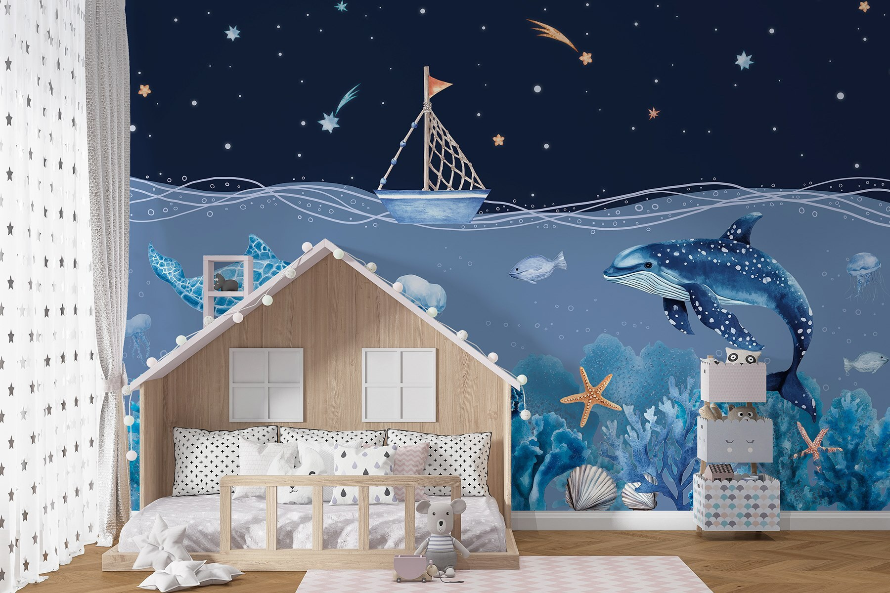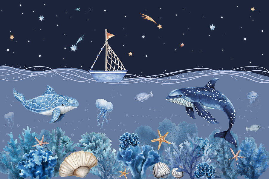 Transformeer elke kamer in een serene onderwater ontsnapping met de “Fotobehang Sea Life met een boot en een walvis”. Stel je een speelse walvis voor die door een dromerige zee glijdt terwijl een charmante boot erboven vaart. Het is alsof je een stukje oceaan op je muur hebt. De koele blauwtinten en zachte groentinten omhullen de ruimte in een rustgevende omhelzing, waardoor die ochtendkoffie aanvoelt als een paradijselijk moment. Deze muurschildering is perfect voor een kinderkamer of een gezellig leeshoekje en zal zeker tot de verbeelding spreken. Bonuspunten voor het vertellen van verhalen – wie wil er nu niet duiken in verhalen over avontuur op volle zee? Duik erin en laat je muren tot leven komen!