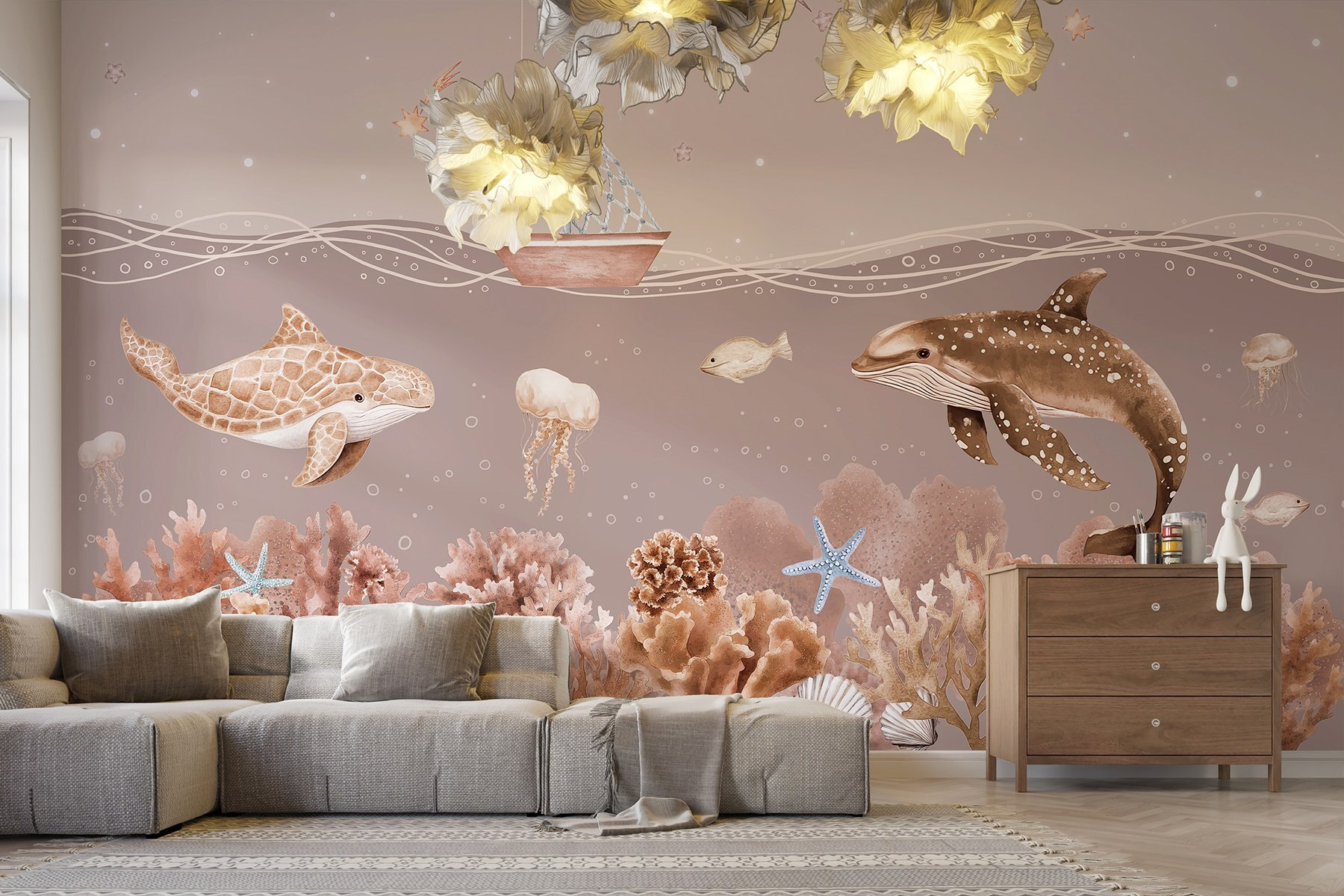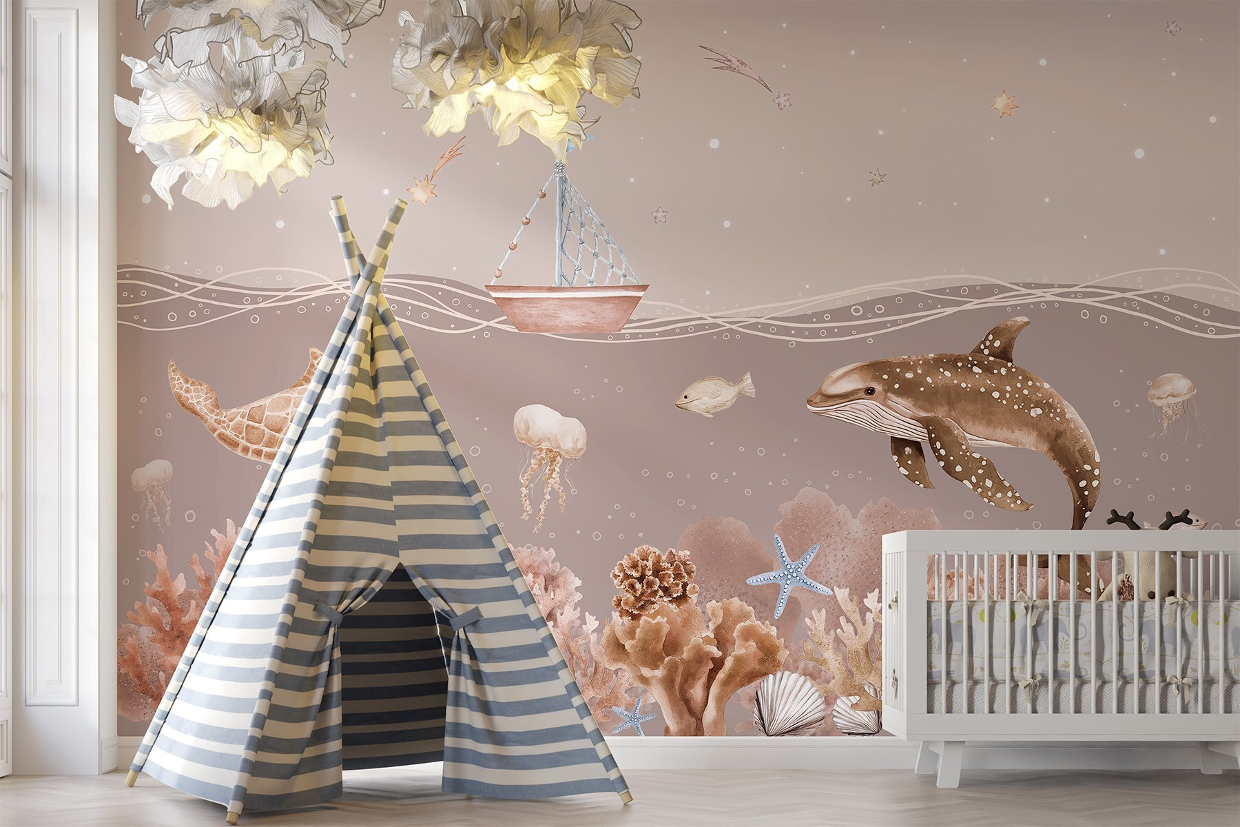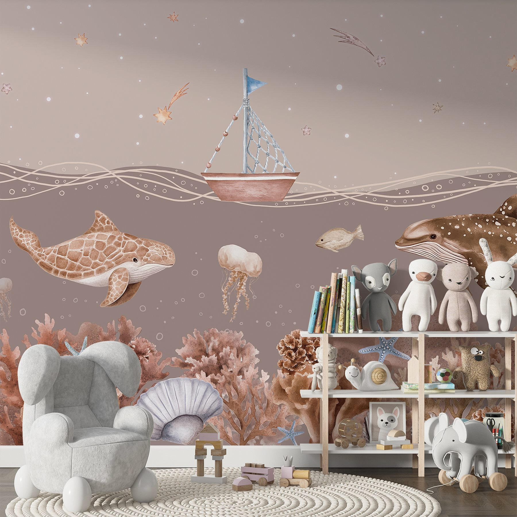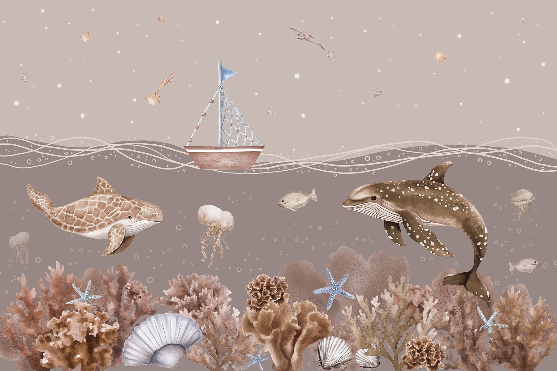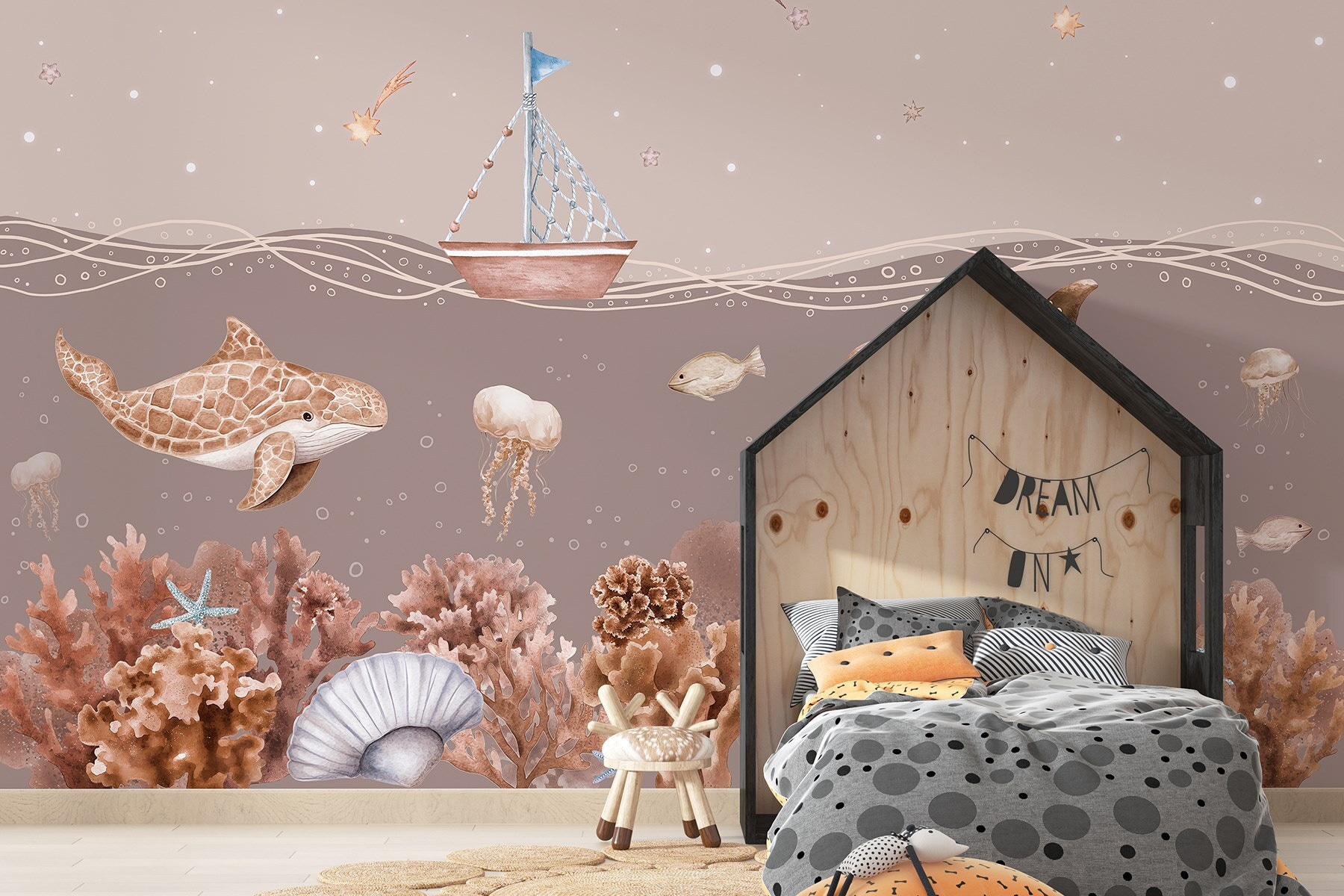 Duik in een wereld vol eigenzinnigheid met deze prachtige muurschildering “Zeeleven met een boot en vissen”. Zie het voor je: een zachte zeilboot dobbert boven speels zeeleven dat bijna levensecht aanvoelt. Het is net een geheim onderwateravontuur in je woonkamer! Stel je voor dat de kinderen (of volwassenen!) onderwaterverhalen verzinnen terwijl ze naar de schildpad, kwallen en het levendige koraal staren. Deze muurschildering geeft elke ruimte een rustige uitstraling en voegt een vleugje vrolijkheid toe. Perfect voor huizen, kinderkamers of waar je maar een vleugje magie van de oceaan nodig hebt. Wie zou niet glimlachen om dit vrolijke tafereel?