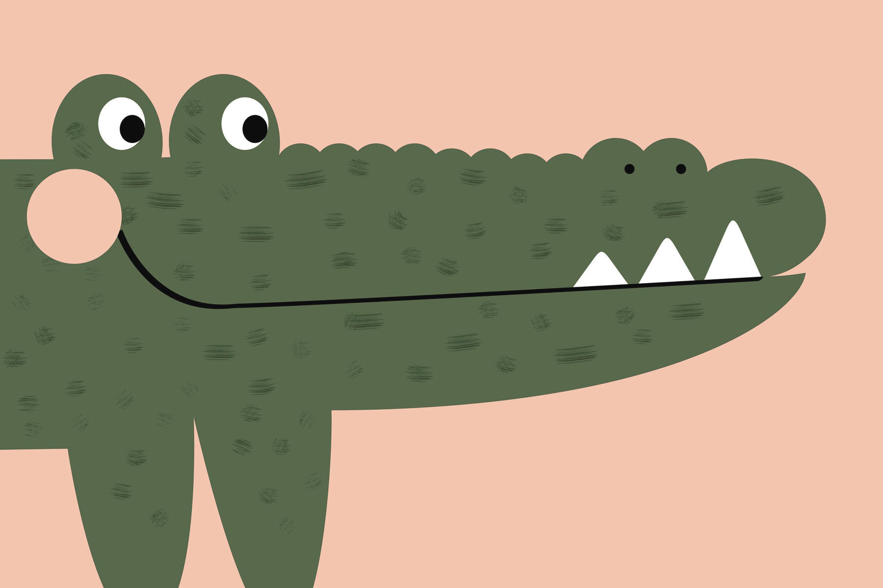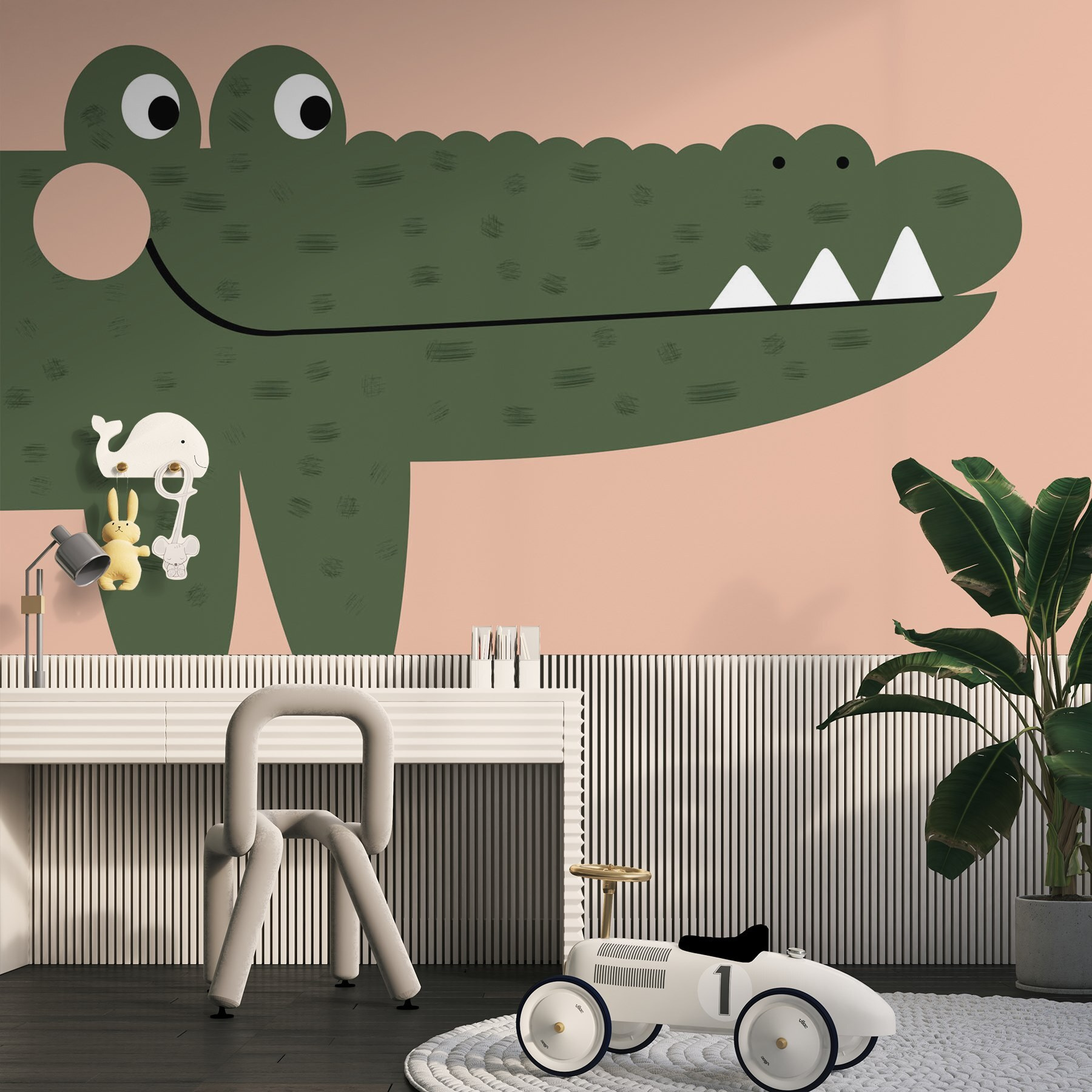 Transformeer elke ruimte met deze charmante muurschildering met een vriendelijke krokodil! Het speelse ontwerp voegt een vleugje eigenzinnigheid toe dat kinderkamers, speelzalen of zelfs een gezellig hoekje van je woonkamer opvrolijkt. Stel je voor: kinderen die giechelen als ze langslopen of vrienden die moeten lachen om de grappige grijns van deze heerlijk geïllustreerde krokodil. De zachte kleuren en leuke vormen nodigen uit tot creativiteit en vormen de perfecte achtergrond voor fantasierijk spel of vertelmomenten. Het is meer dan alleen decor; het is een uitnodiging voor avontuur! Laat deze vrolijke krokodil leuke herinneringen oproepen als hij aan je muur hangt. Wie wil er nou geen speelse metgezel die over zijn kamer waakt?