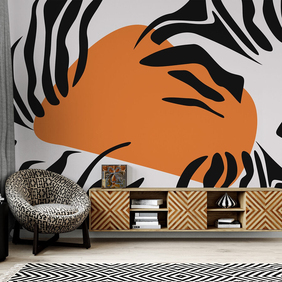 Een ruimte transformeren kan soms aanvoelen als een goocheltruc en dat is precies wat deze muurschildering doet. “Dynamische patronen in gedurfde kleuren” geeft een energieke uitstraling die iedereen zal doen opkijken. Stel je de levendige zwarte en witte strepen voor die verstrengeld zijn met een vleugje levendig oranje. Het is alsof het kunstwerk je uitnodigt voor een speels junglefeestje in je woonkamer.