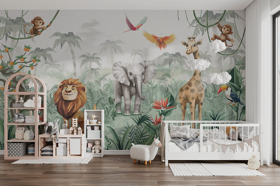 Tover elke ruimte om in een levendig jungleavontuur met deze charmante muurschildering! Stel je een olifant en een vrolijke leeuw voor die dartelen tussen vrienden zoals apen en kleurrijke vogels – het lijkt wel een feestje op je muur! Deze muurschildering brengt een gevoel van vreugde en verwondering, perfect om de verbeelding van kinderen aan te wakkeren of een speels tintje aan elke kamer te geven. Stel je gezellige leeshoekjes voor waar kleintjes nieuwe werelden ontdekken, of vrolijke speelkamers die aanvoelen als een safari. Het is alsof je de natuur in huis haalt, zonder dat je rommelig hoeft op te ruimen!