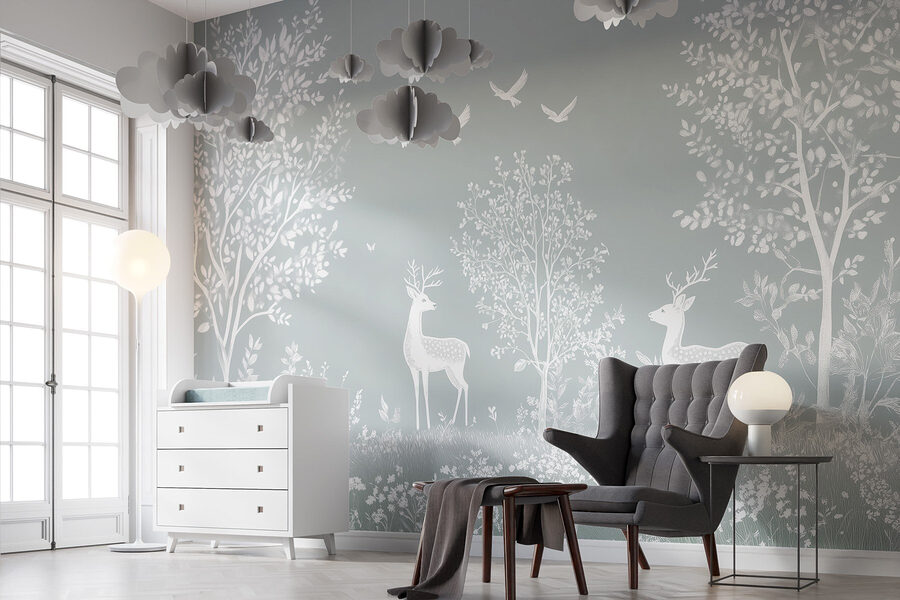 Transformeer je kamer in een serene ontsnapping met deze betoverende muurschildering met sierlijke witte herten die door een zacht, bladerrijk bos zwerven. Stel je voor dat je je kamer binnenstapt en het gevoel hebt dat je in een dromerig bos bent beland vol zacht gefluister van de natuur. De delicate vogels die erboven fladderen voegen een vleugje eigenzinnigheid toe, waardoor het een perfecte achtergrond is voor gezellige avonden of inspirerende ochtenden. Het is net alsof je thuis een vredig toevluchtsoord hebt! Of je nu thee drinkt of een boek leest, deze muurschildering nodigt uit tot die kleine momenten van rust. Bovendien is het een geweldige gespreksstarter – wie wil er nou niet praten over zijn geheime bos?