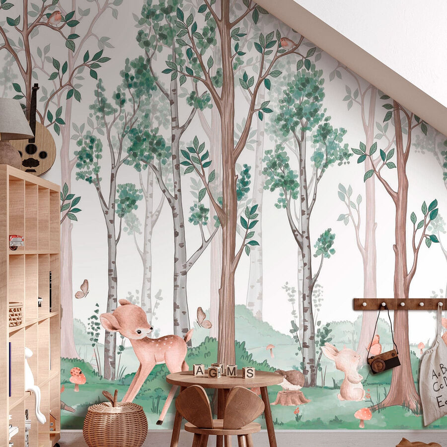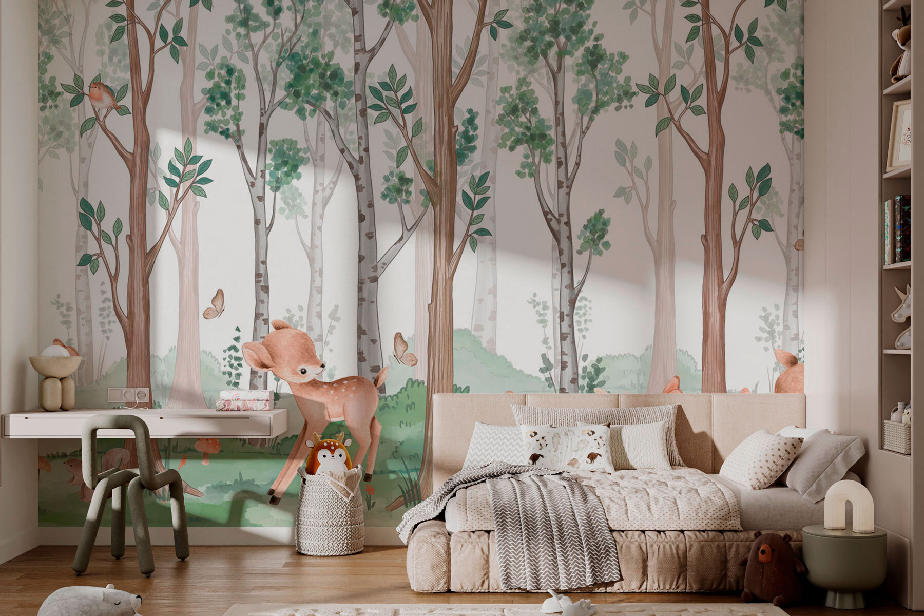 Tover je muren om in een sereen bos met deze charmante muurschildering met speelse dieren en hoge, fluisterende bomen. Stel je een zacht briesje voor dat de bladeren doet ritselen terwijl nieuwsgierige hertjes en speelse konijntjes hun huis in het bos verkennen. Elke blik op de zachte kleuren van deze muurschildering kan je meevoeren naar een vredige plek, waar alle zorgen oplossen als ochtendmist. Deze muurschildering is ideaal voor een gezellige woonkamer of een grillige kinderkamer en nodigt de natuur uit om binnen te komen en vreugde en verbeelding te stimuleren. Het is net alsof je een stukje bos in huis hebt – zonder de insecten en modder natuurlijk! Serieus, kan decor nog gezelliger?