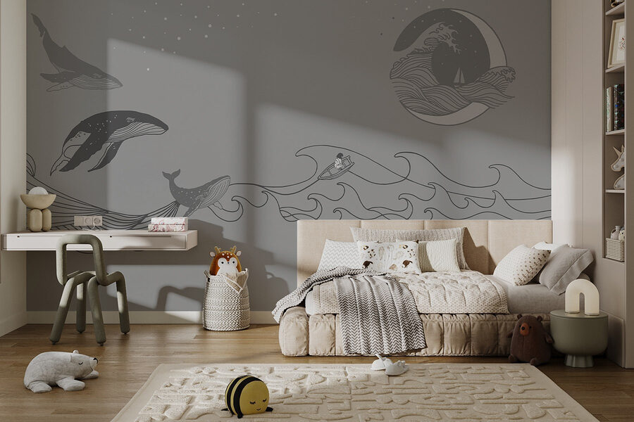 Deze muurschildering geeft een rustgevende sfeer, perfect voor woonkamers of gezellige hoekjes. Stel je voor dat je aan je ochtendkoffie nipt, een blik werpt op deze vriendelijke reuzen en al je zorgen weg voelt drijven, zoals zonnebrandcrème op een warme dag! De zachte kleuren nodigen uit tot een gevoel van rust, waardoor het een heerlijke achtergrond is voor luie middagen of diepgaande gesprekken. Het is meer dan decor; het is een ervaring die wacht om zich te ontvouwen. Wie weet inspireert het je tot een paar eigen nautische avonturen!