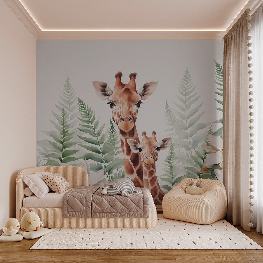 Verander je ruimte in een grillige tuin met deze prachtige muurschildering met sierlijke giraffen die door weelderig groen en delicate bloemen gluren. Het is alsof je een vleugje savanne in je woonkamer brengt! Stel je voor dat je ‘s ochtends aan je koffie nipt terwijl deze vriendelijke reuzen over je waken – zo sereen. Perfect voor kinderkamers, speelzalen of waar dan ook die een vleugje speelsheid en charme kunnen gebruiken. En wie zou er niet glimlachen om die schattige gezichtjes? Het is niet alleen decor; het voelt als een knuffel van de natuur, die warmte en vreugde uitstraalt in elke hoek.