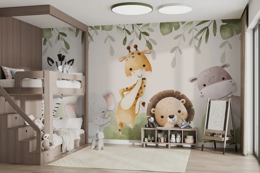 Fleur elke kamer op met deze prachtige muurschildering met een speelse parade van schattige dieren onder bladerrijke luifels. Stel je een nieuwsgierige giraffe voor die poseert, terwijl een vrolijke olifant ronddanst – hoe lief is dat? Dit grillige tafereel brengt warmte en speelsheid, perfect voor een kinderkamer of een gezellig leeshoekje. Elk personage lijkt zijn eigen verhaaltje te hebben, wat aanzet tot creativiteit en een glimlach. De zachte kleuren en vriendelijke uitdrukkingen nodigen uit tot rust en veranderen elke ruimte in een mini-jungleverblijf. Geloof me, je zult glimlachen elke keer als je langsloopt!