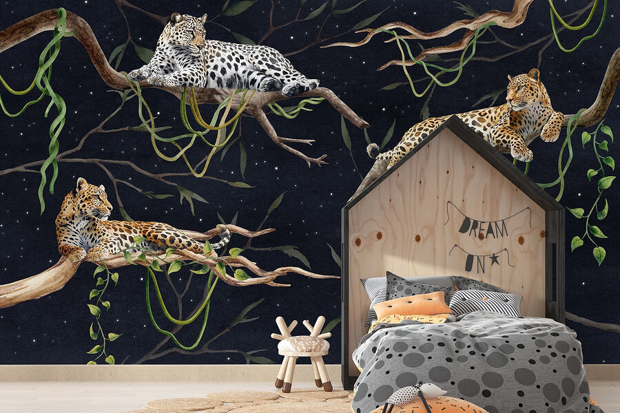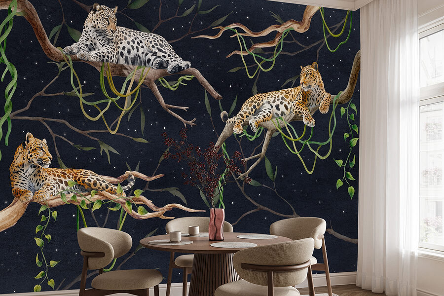 Verander uw muren in een wilde oase met deze prachtige muurschildering van luipaarden die gracieus op takken liggen. Het is alsof u een stukje jungle in uw woonkamer uitnodigt, zonder de vochtigheid of vervelende muggen! Stelt u zich eens voor dat u ‘s ochtends van uw koffie geniet terwijl zij u gezelschap houden, er zo nonchalant en moeiteloos cool uitzien. De rijke kleuren en gedetailleerde details zijn een lust voor het oog en perfect om elke ruimte een vleugje elegantie te geven. Of je nu een natuurliefhebber bent of gewoon iemand die unieke kunst waardeert, de warmte en charme van deze muurschildering kan gesprekken op gang brengen en een gezellige sfeer creëren. Bovendien, wie wil er nu geen drietal luipaarden in huis hebben? Ze worden misschien wel het nieuwe middelpunt van je huis!