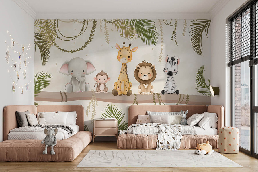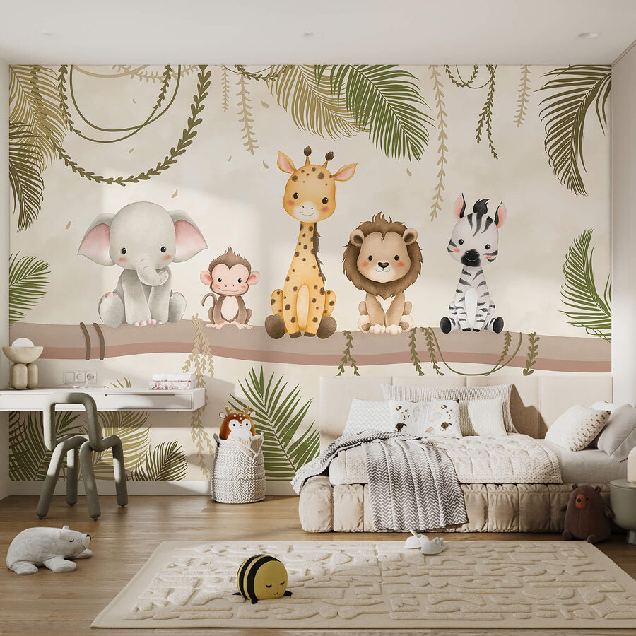 Tover je kamer om in een levendige jungle met deze prachtige muurschildering met een schattige groep dierenvriendjes die op een stevige tak zitten. Stel je voor: een brutale aap, een vriendelijke olifant, een charmante giraffe, een vriendelijke leeuw en een speelse zebra, allemaal klaar om vreugde en warmte aan je muren te brengen. Het is net alsof je een minisafari thuis hebt. Deze muurschildering is perfect voor een speelkamer of een gezellig hoekje en nodigt uit tot lachen en verbeelding. Wie wil er nou niet thuiskomen bij een stel vriendelijke gezichten? Perfect voor kinderen van alle leeftijden, of gewoon iedereen met een groot hart voor dieren!