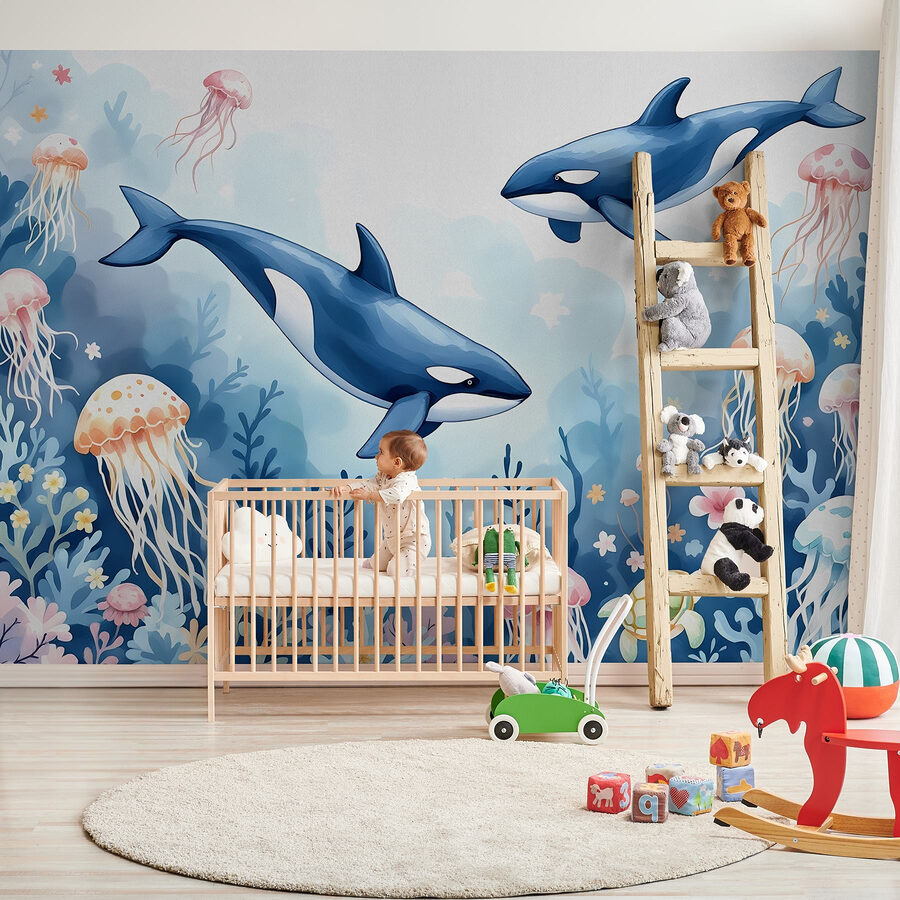 Verander uw ruimte in een onderwaterwonderland met deze betoverende muurschildering met walvissen en een speelse schildpad die dartelen in levendige oceaanwateren. Stel u voor dat u een kamer binnenstapt waar kwallen lui ronddrijven en kleurrijke koralen zwaaien alsof ze dansen. Het is alsof u uw eigen stukje zee thuis heeft! Deze muurschildering is perfect voor een kustsfeer en laat je dagdromen over stranddagen en zeewind. Wie zou er niet glimlachen bij het zien van schildpadden die hun gang gaan in een zee van rust? Dit kunstwerk is niet alleen decoratie, het is een uitnodiging om te ontsnappen en op ontdekking te gaan – duikuitrusting niet nodig!