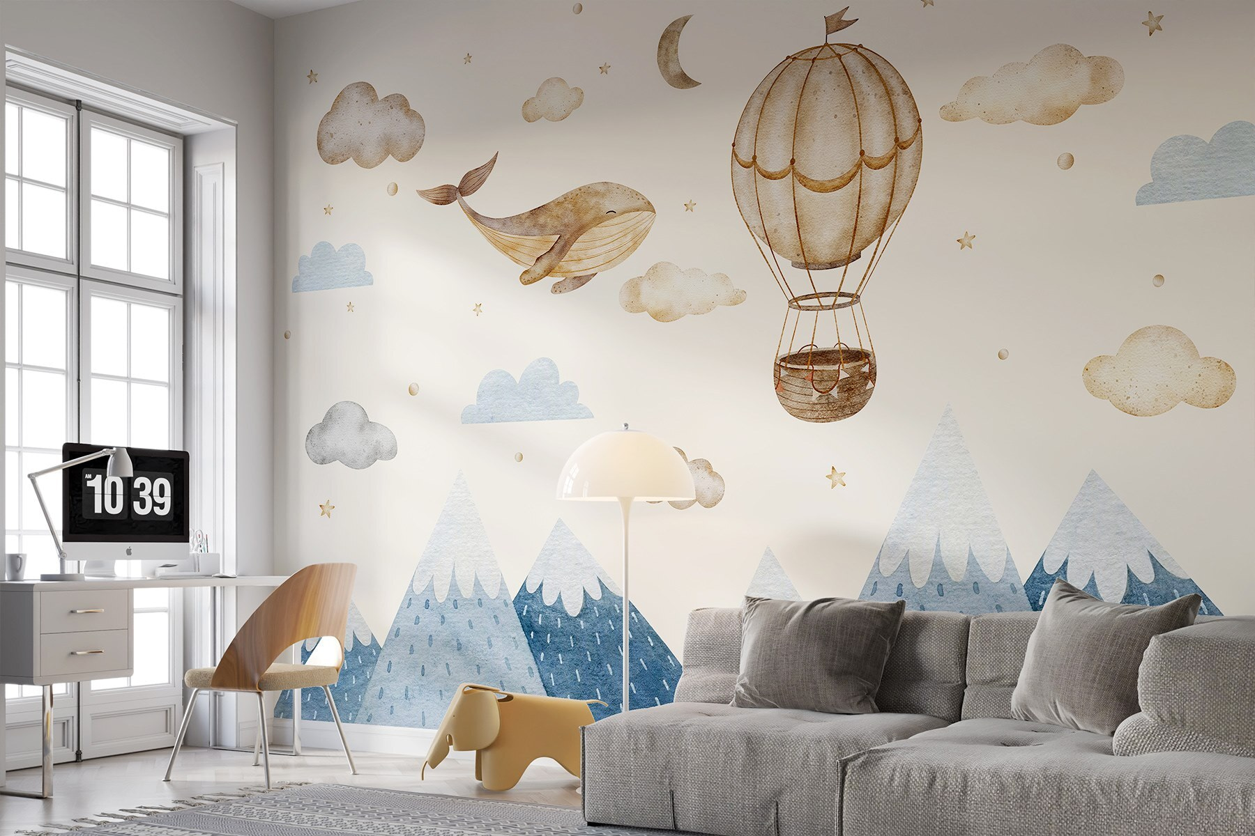 Stel je voor dat je een kamer binnenstapt vol wolken, sterren en een speelse walvis die naast een grillige heteluchtballon zweeft. Deze muurschildering is niet alleen decoratief; het is een avontuur dat staat te gebeuren! Stel je voor: kinderen die met grote ogen zien dat ze een reis door de lucht maken, terwijl volwassenen alleen maar kunnen glimlachen om het charmante tafereel. Het rustgevende kleurenpalet zorgt voor een kalme sfeer – ideaal voor slaapkamers of gezellige hoekjes. Of je nu droomt, je gedachten laat gaan of gewoon een moment van rust neemt, deze muurschildering voegt een uniek tintje toe dat zowel magisch als speels aanvoelt. Perfect om je verbeelding aan te wakkeren!