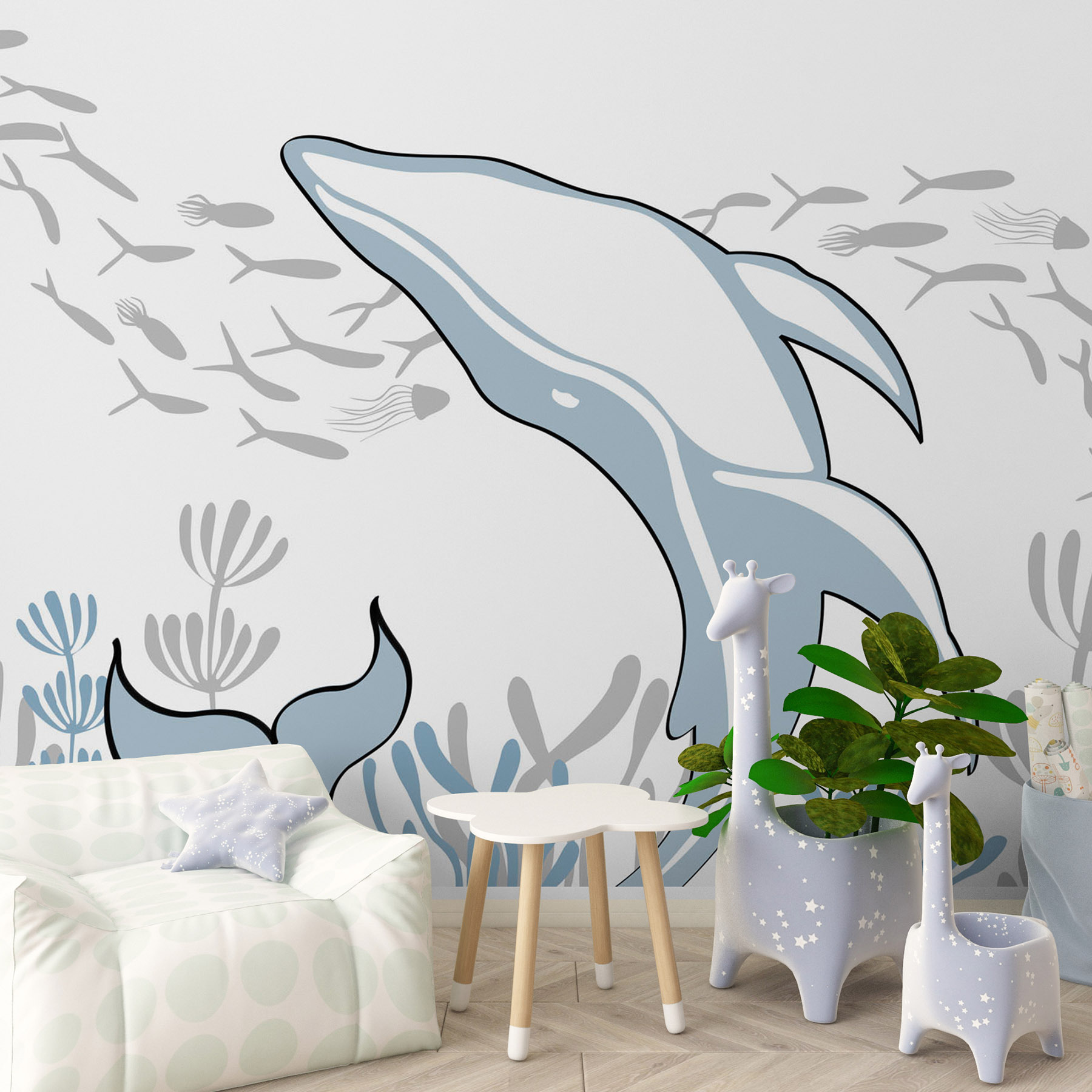 Duik in een wereld vol wonderen met deze muurschildering van een speelse dolfijn zwemmend in de oceaan. Stel je voor dat je een kamer verandert in een onderwateroase, waar elke blik op de muurschildering je meeneemt naar zonovergoten golven en zeebriesjes. De rustgevende kleuren creëren een ontspannen sfeer – perfect voor een gezellige leeshoek of een levendige speelkamer. Zie kinderen al giechelen als ze visvriendjes zien rondfladderen. Stel je voor dat elke dag als een stranddag kan voelen. Laat de warmte van de oceaan je ruimte overspoelen, zodat het voelt als een vakantie thuis!