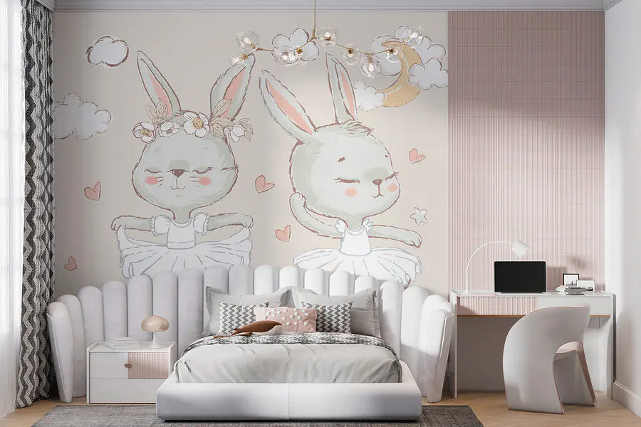 Op zoek naar een muurschildering die pure magie is? Maak kennis met “Muurschilderingen w08008”. Stel je deze schattige konijnenballerina’s voor die rond je muren draaien! Het is net een dromerige dans van pluizige wolken, speelse hartjes en een zachte maan – perfect voor een gezellige kinderkamer of een grillige leefruimte. Stel je voor: een luie zondagochtend, het zonlicht dat naar binnen glijdt en je nipt met een glimlach aan je koffie terwijl je naar deze charmante beestjes kijkt. Het is niet zomaar kunst; het is een betoverende charme die je hart doet smelten elke keer als je het ziet. Ideaal voor dierenliefhebbers, dagdromers of iedereen die een beetje eigenzinnigheid in zijn leven nodig heeft – deze muurschildering verandert elke kamer in een heerlijke dagdroom.