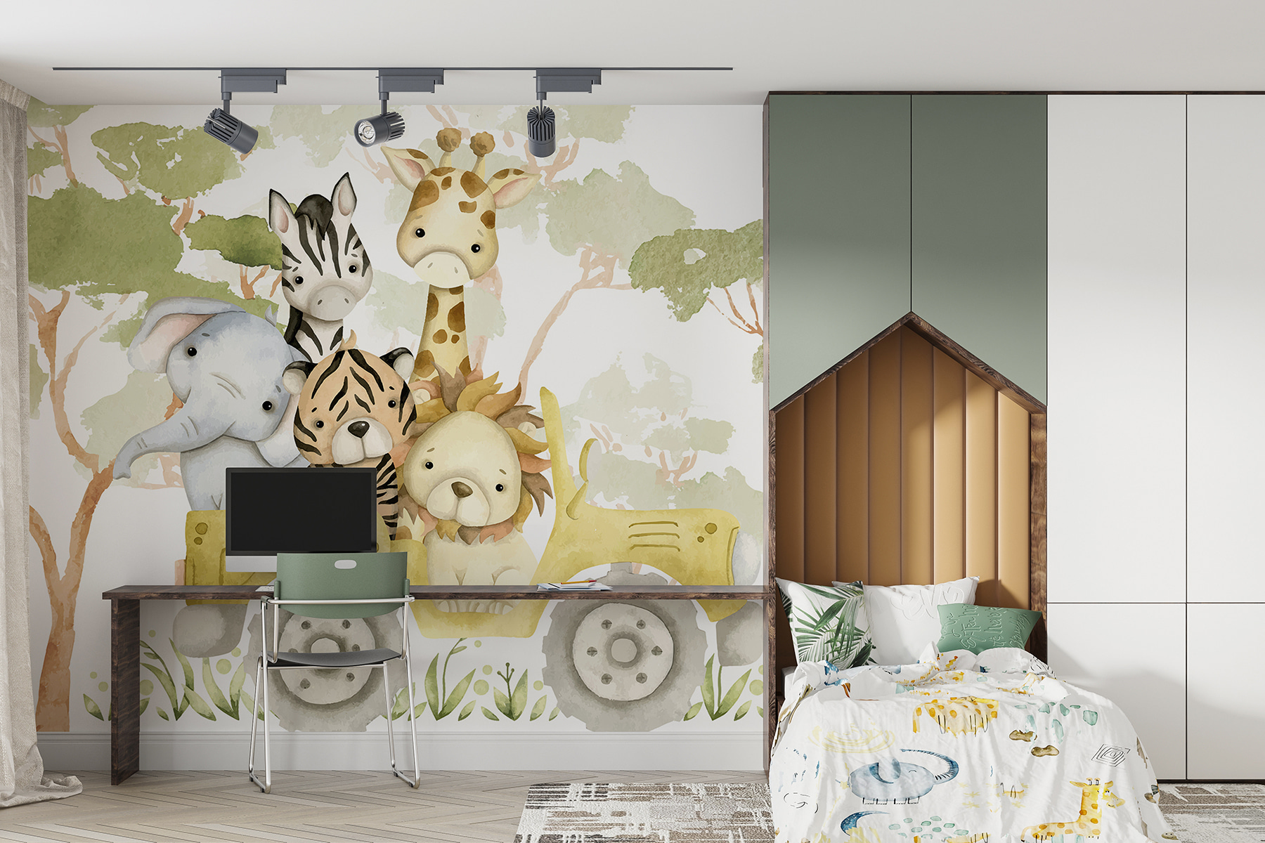 Stel je voor: je loopt een kamer binnen en deze schattige wezens begroeten je met hun nieuwsgierige uitdrukkingen. Het is alsof ze je uitnodigen om mee te doen aan hun kleine escapade! De aquarelstijl geeft een zacht, rustgevend gevoel – het is bijna alsof er zich een sprookjesscène in je huis ontvouwt. Dus of je nu een kinderkamer wilt veranderen of gewoon een vleugje eigenzinnigheid in je leven wilt, met deze muurschildering zit je goed.
