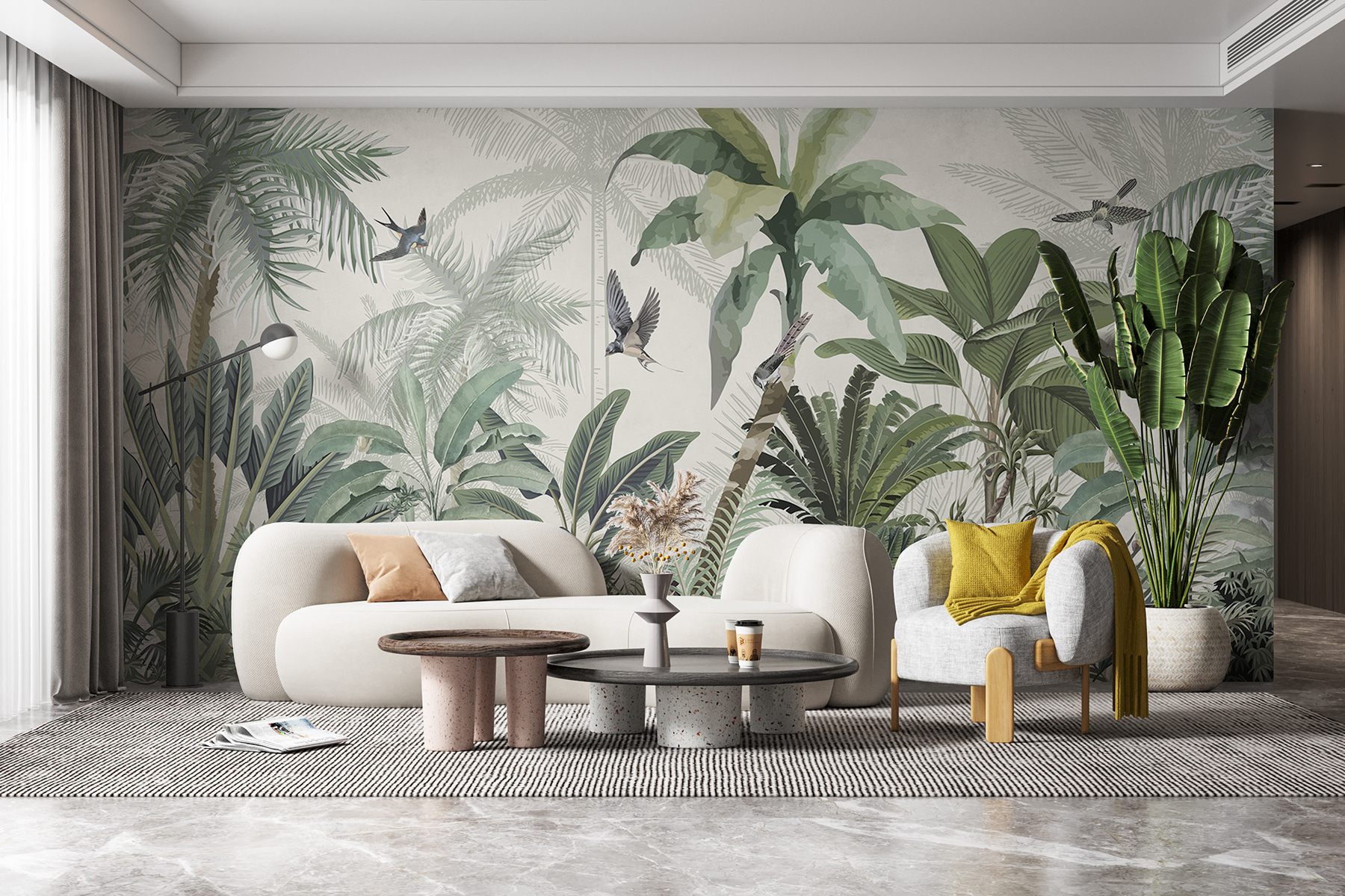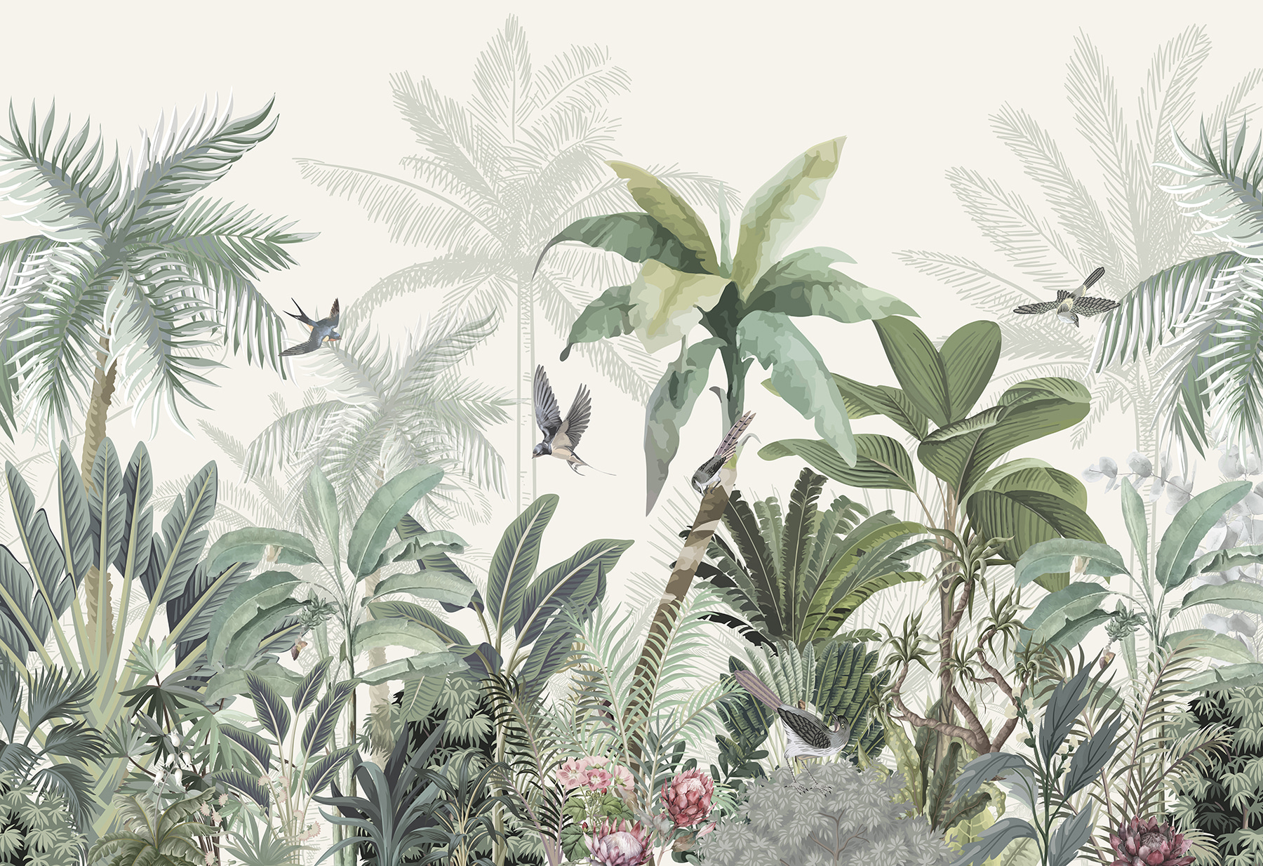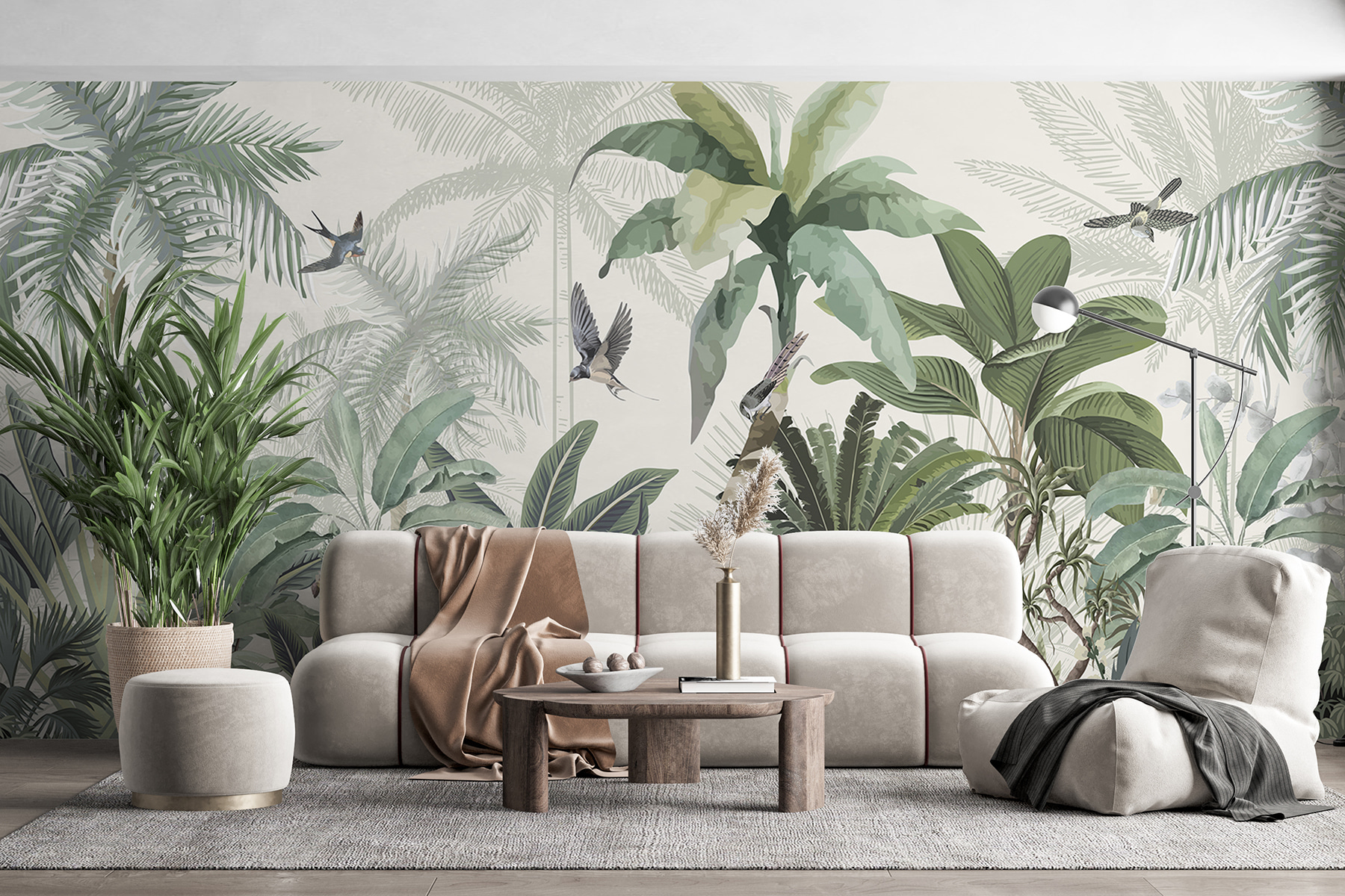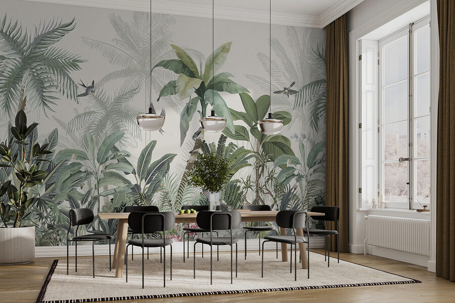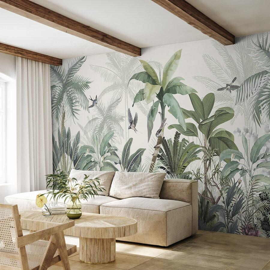 Tover elke ruimte om in een tropische oase met deze prachtige muurschildering. Het is alsof je een stukje jungle in huis hebt, compleet met weelderig groen en vrolijke vogels die rondfladderen. Stel je voor dat je ‘s ochtends aan je koffie nipt terwijl je wordt begroet door zachte, tropische sferen – echt, is er een betere manier om de dag te beginnen? Dit behang verandert niet alleen de kamer; het nodigt de natuur uit om naar binnen te komen en fluistert naar winderige middagen en zonovergoten avonturen. Perfect voor een woonkamer of zelfs een gezellig leeshoekje, het is een kleine ontsnapping aan de muur. Elke blik voelt als een mini-vakantie, vanuit het comfort van thuis.