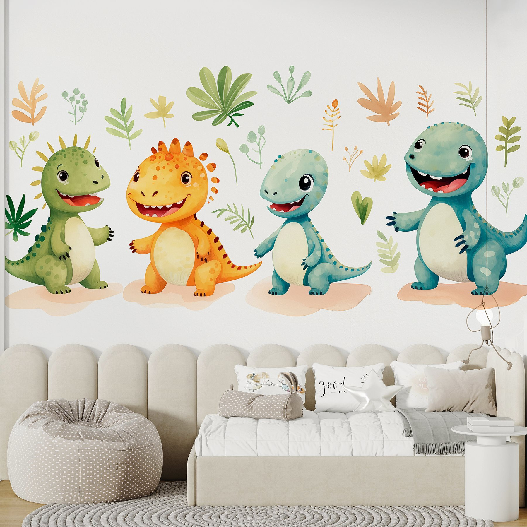 Tover elke ruimte om in een levendig avontuur met deze prachtige muurschildering met een schattige groep tekenfilmachtige dinosaurussen. Stel je voor: een kamer waar kleintjes kunnen giechelen om de grappige uitdrukkingen van deze vriendelijke dino vriendjes, elk met een unieke kleur en persoonlijkheid. Het is niet alleen decor; het is alsof je een stukje van een kleurrijk verhalenboek tot leven brengt! Deze muurschildering is perfect voor kinderkamers of speelzalen en creëert een vrolijke sfeer die de verbeelding prikkelt. Kinderen zullen zich in een wereld wanen waar elke dag een nieuwe prehistorische escapade is. En wie wil er nou niet elke ochtend wakker worden met deze charmante wezens? Het is een vrolijke plons plezier die zelfs ouders een beetje zal doen glimlachen!