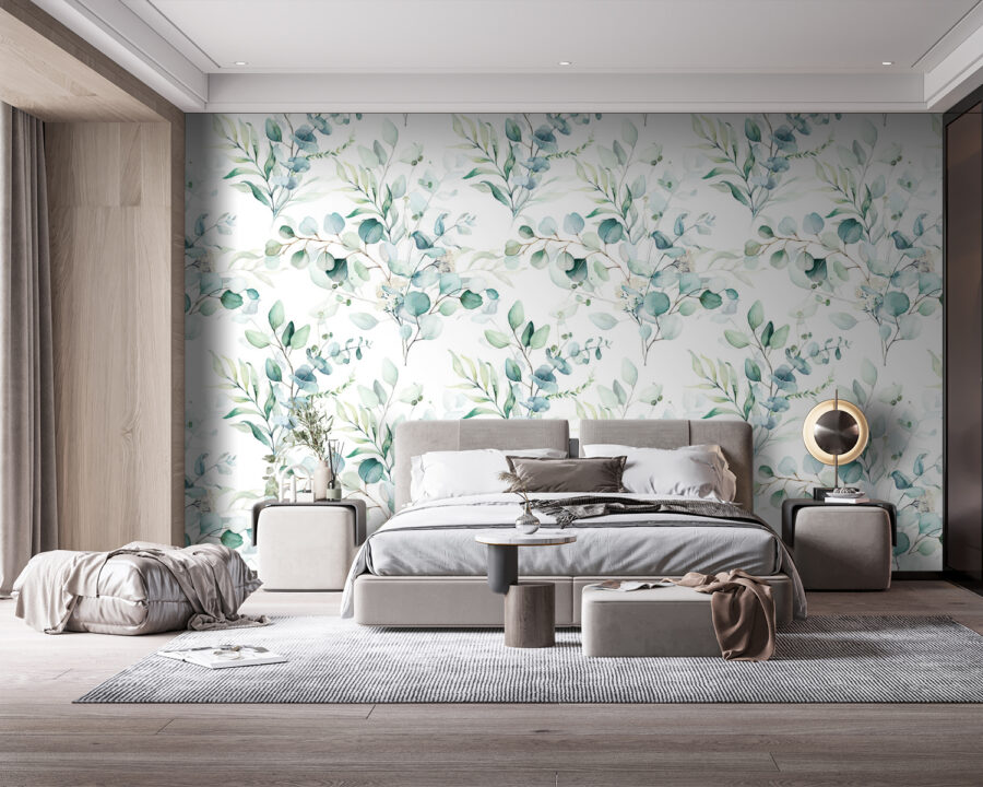 Door een ruimte te transformeren met deze muurschildering van bladeren en takken, haal je een stukje natuur in huis. Stel je voor dat je in je woonkamer staat, omringd door een rustgevende mix van groentinten en subtiele blauwtinten. Het is alsof er een frisse bries doorheen waait, maar dan zonder de insecten! Dit ontwerp straalt rust uit en is perfect voor leeshoekjes of gezellige eethoeken.