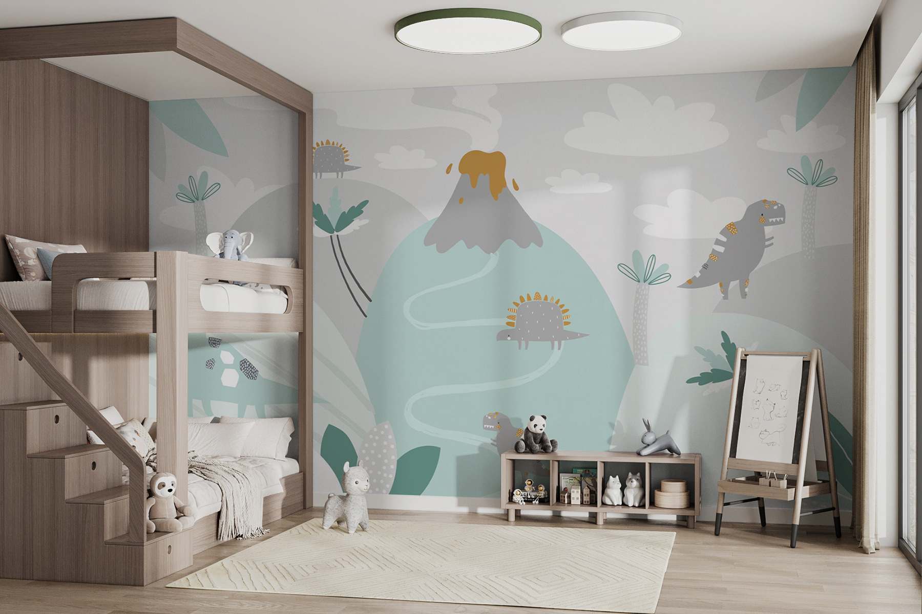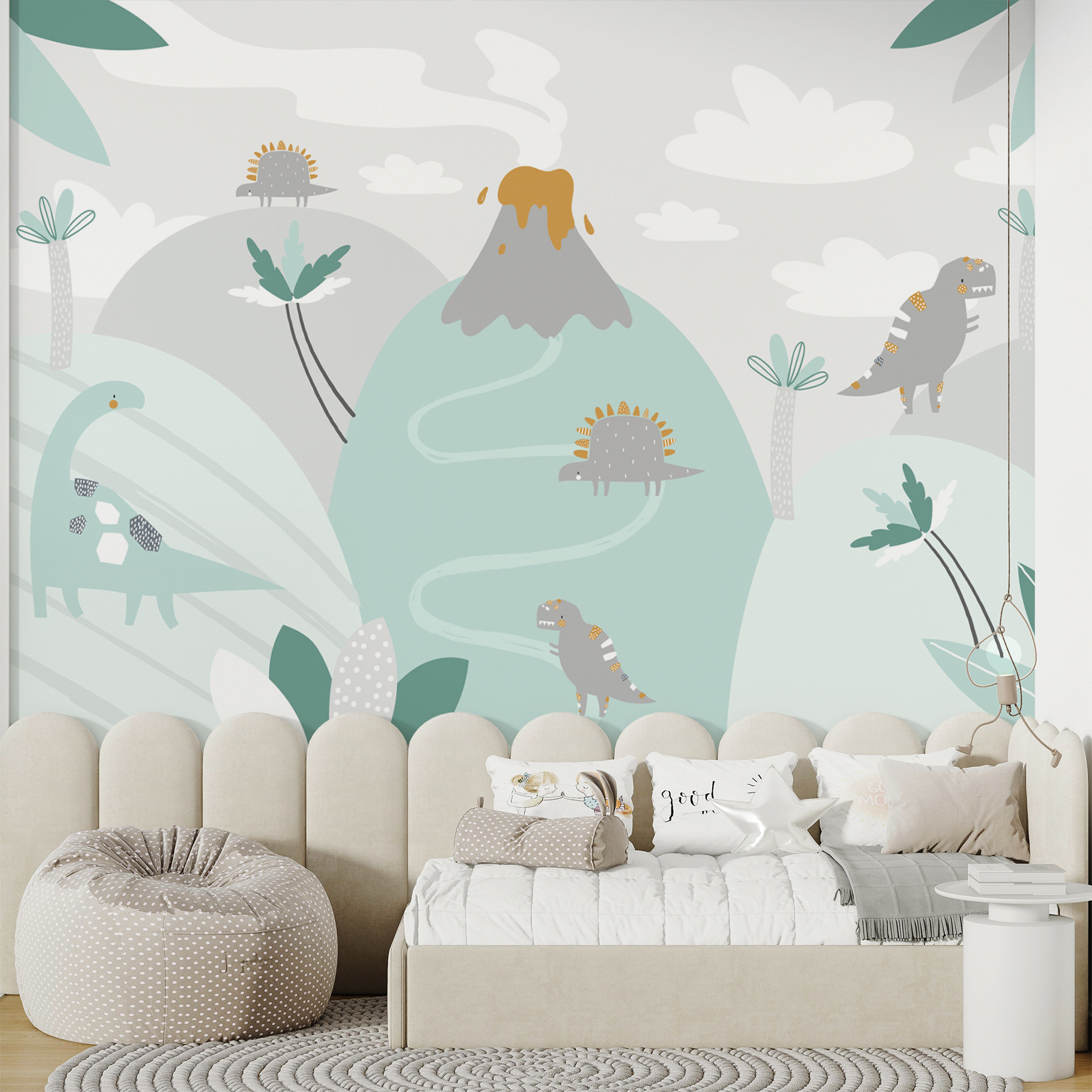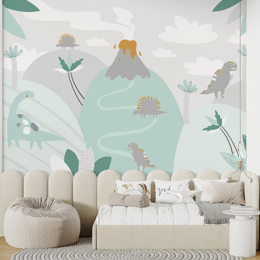 Heb je er ooit aan gedacht om je ruimte om te toveren in een episch jungleavontuur? Deze “Cartoon of a Volcano” muurschildering doet precies dat. Stel je dinosaurussen voor die in felle kleuren rond een schattige (niet te enge) uitbarstende vulkaan kronkelen. Het is net een scène die rechtstreeks uit de verbeelding van een kind komt, perfect om nieuwsgierigheid en plezier te wekken in elke kamer. Of het nu een kinderkamer of speelkamer is, deze muurschildering neemt iedereen mee naar een grillige wereld waar vriendelijke dinosaurussen rondzwerven en de opwinding van de gloed van een vulkaan tot verwondering leidt. Bonus: het voegt een serieuze charme en gespreksstof toe. Perfect voor jonge dino’s en mensen met een jong hart. Pure magie aan je muur!
