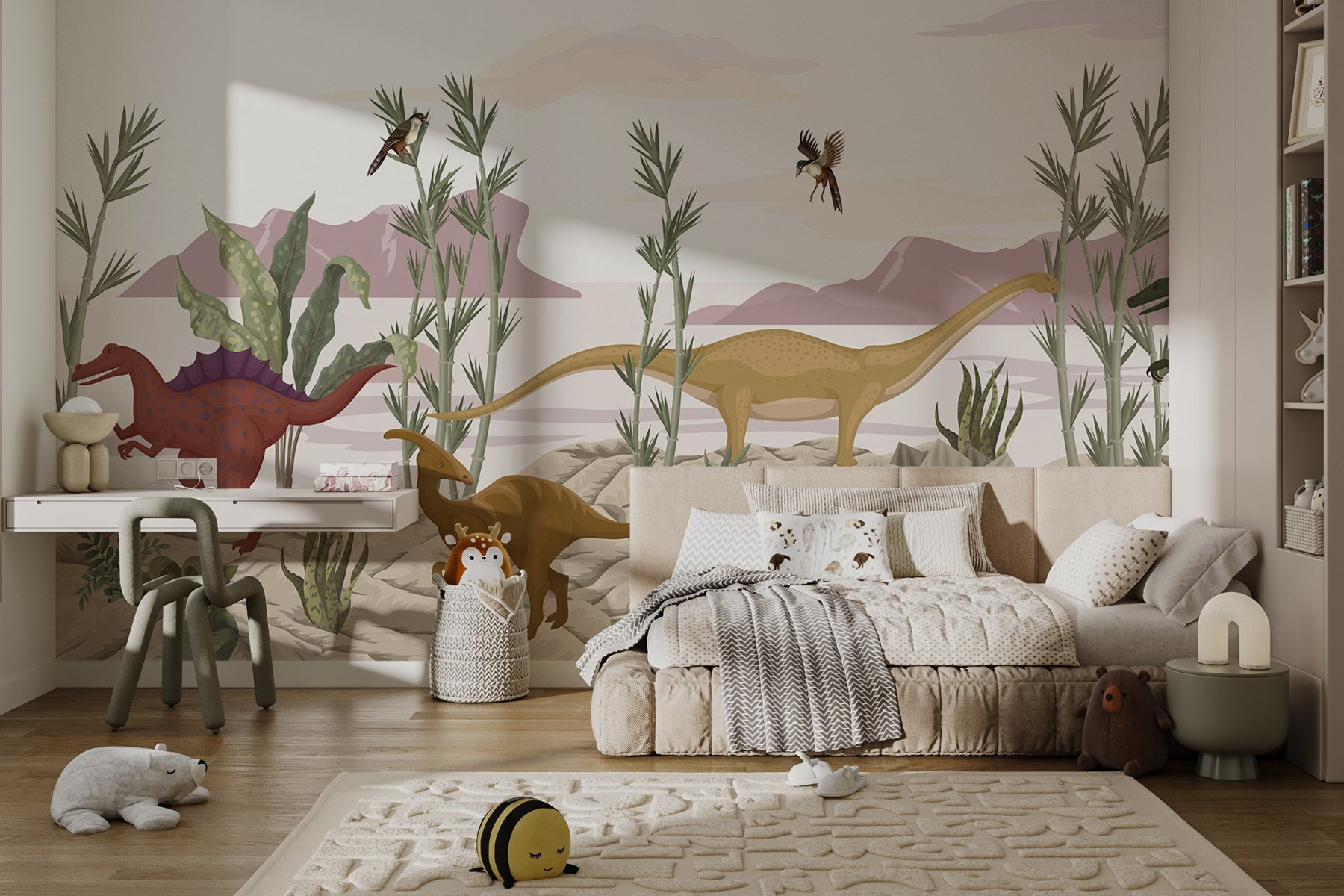 Transformeer elke ruimte met deze levendige muurschildering met een levendige groep dinosaurussen die een woestijnlandschap verkennen. Stel je voor dat je een kamer binnenloopt waar vriendelijke reuzen zoals de zachtaardige Brachiosaurus en de nieuwsgierige Stegosaurus tot leven lijken te komen op je muren. De zachte aardetinten en het speelse groen zorgen voor een rustige en toch spannende sfeer. Het is de perfecte gespreksstarter – kinderen zullen graag hun favorieten aanwijzen terwijl ze stiekem dromen over prehistorische avonturen. Of het nu in een speelkamer of een gezellig hoekje is, deze muurschildering neemt je mee naar een wereld waar dinosaurussen gedijen. Wie wil er nu niet een beetje dino-magie in zijn kamer?