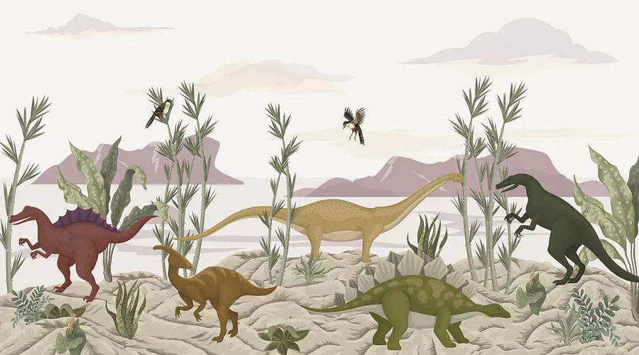 Transformeer elke ruimte met deze levendige muurschildering met een levendige groep dinosaurussen die een woestijnlandschap verkennen. Stel je voor dat je een kamer binnenloopt waar vriendelijke reuzen zoals de zachtaardige Brachiosaurus en de nieuwsgierige Stegosaurus tot leven lijken te komen op je muren. De zachte aardetinten en het speelse groen zorgen voor een rustige en toch spannende sfeer. Het is de perfecte gespreksstarter – kinderen zullen graag hun favorieten aanwijzen terwijl ze stiekem dromen over prehistorische avonturen. Of het nu in een speelkamer of een gezellig hoekje is, deze muurschildering neemt je mee naar een wereld waar dinosaurussen gedijen. Wie wil er nu niet een beetje dino-magie in zijn kamer?